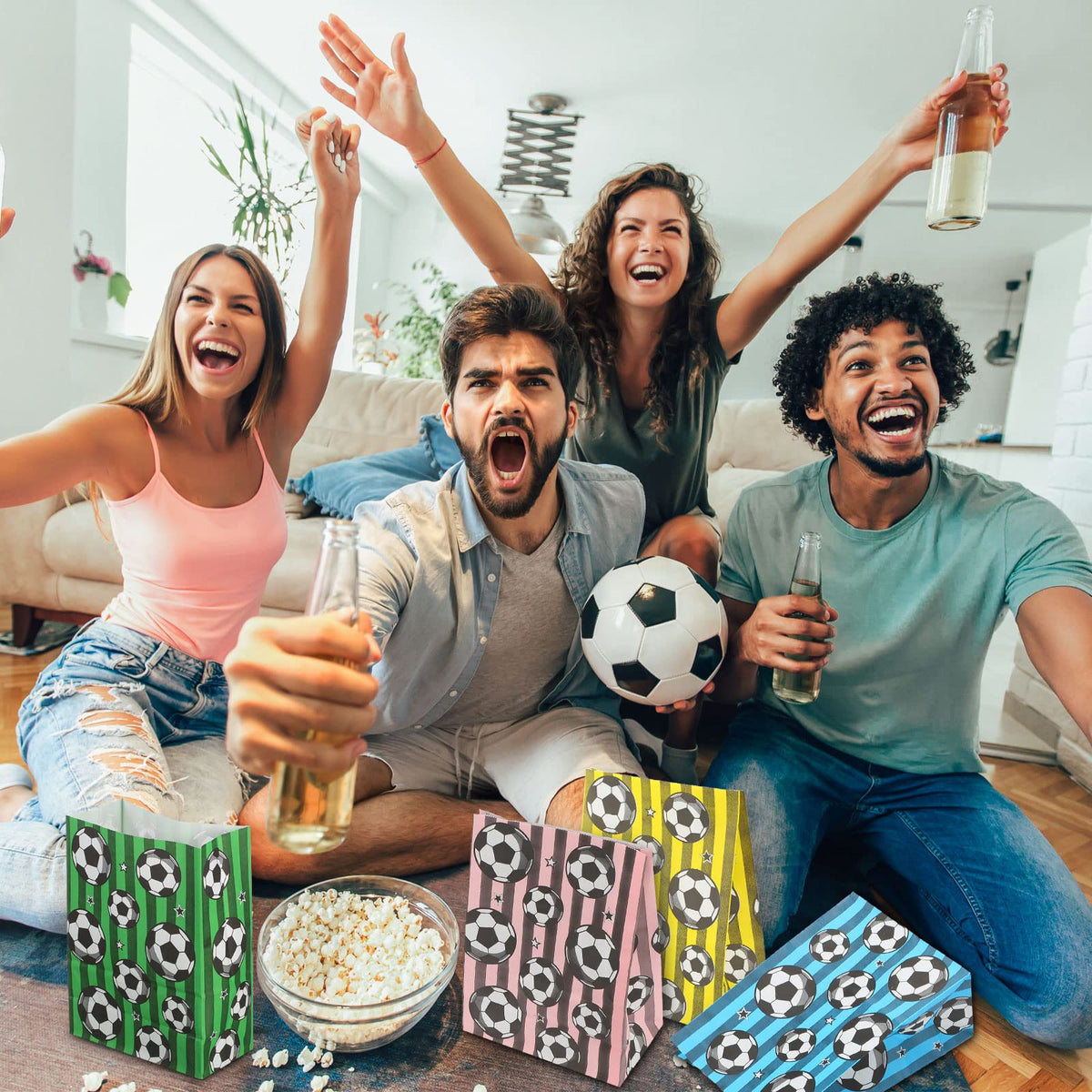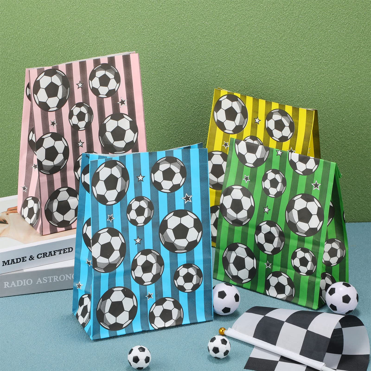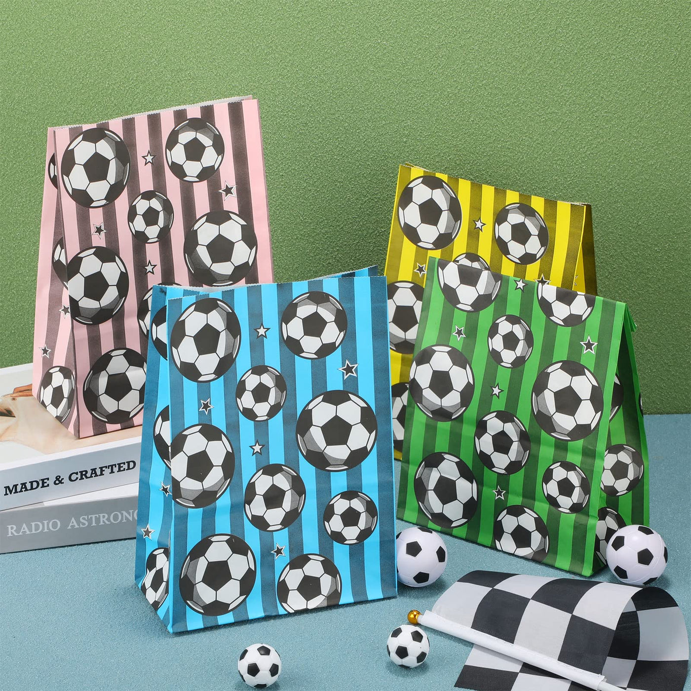 - Q: What colors are available for the soccer favor bags? A: The bags feature a color combination of green, blue, pink, and yellow.