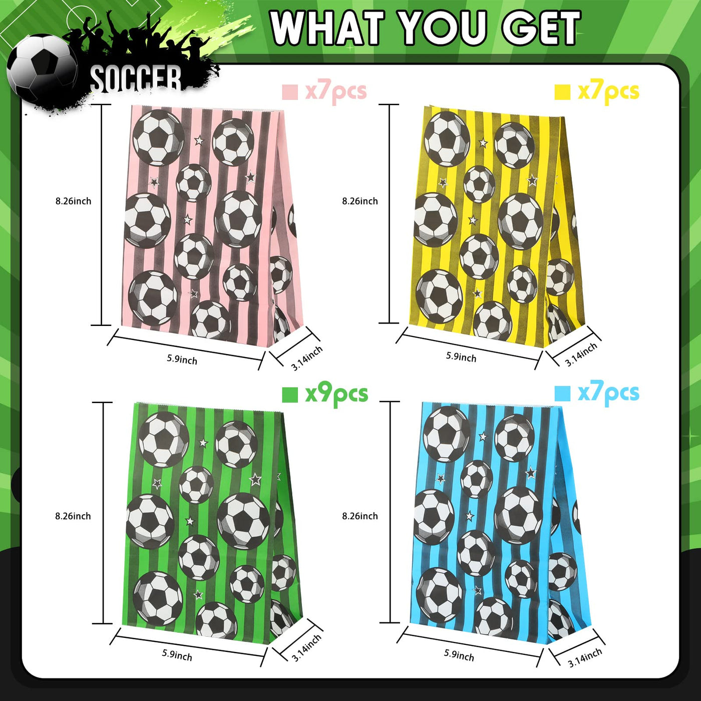 - Q: What are the dimensions of the soccer party favor bags? A: The soccer party favor bags measure approximately 5.9 x 3.1 x 8.3 inches.