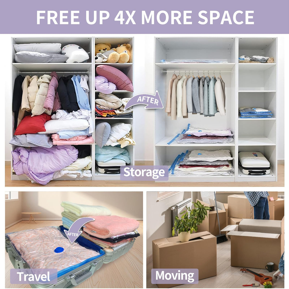 • Q: What are vacuum storage bags used for? A: Vacuum storage bags are designed to compress and store clothing, blankets, comforters, bedding, pillows, towels, and other items, saving space and organizing your home or travel.