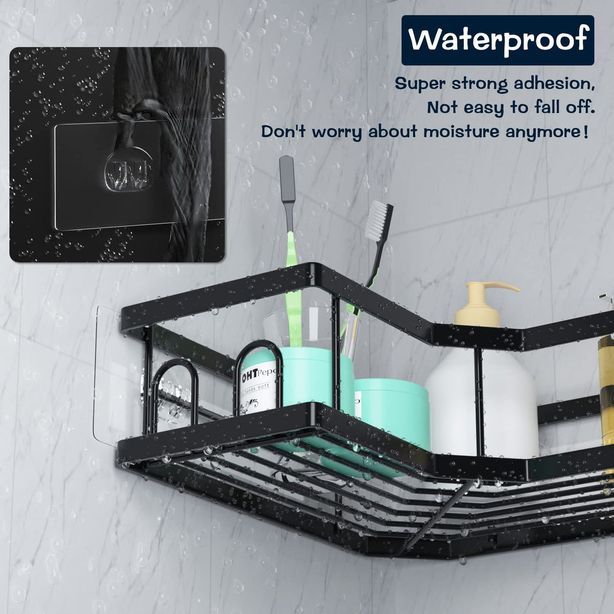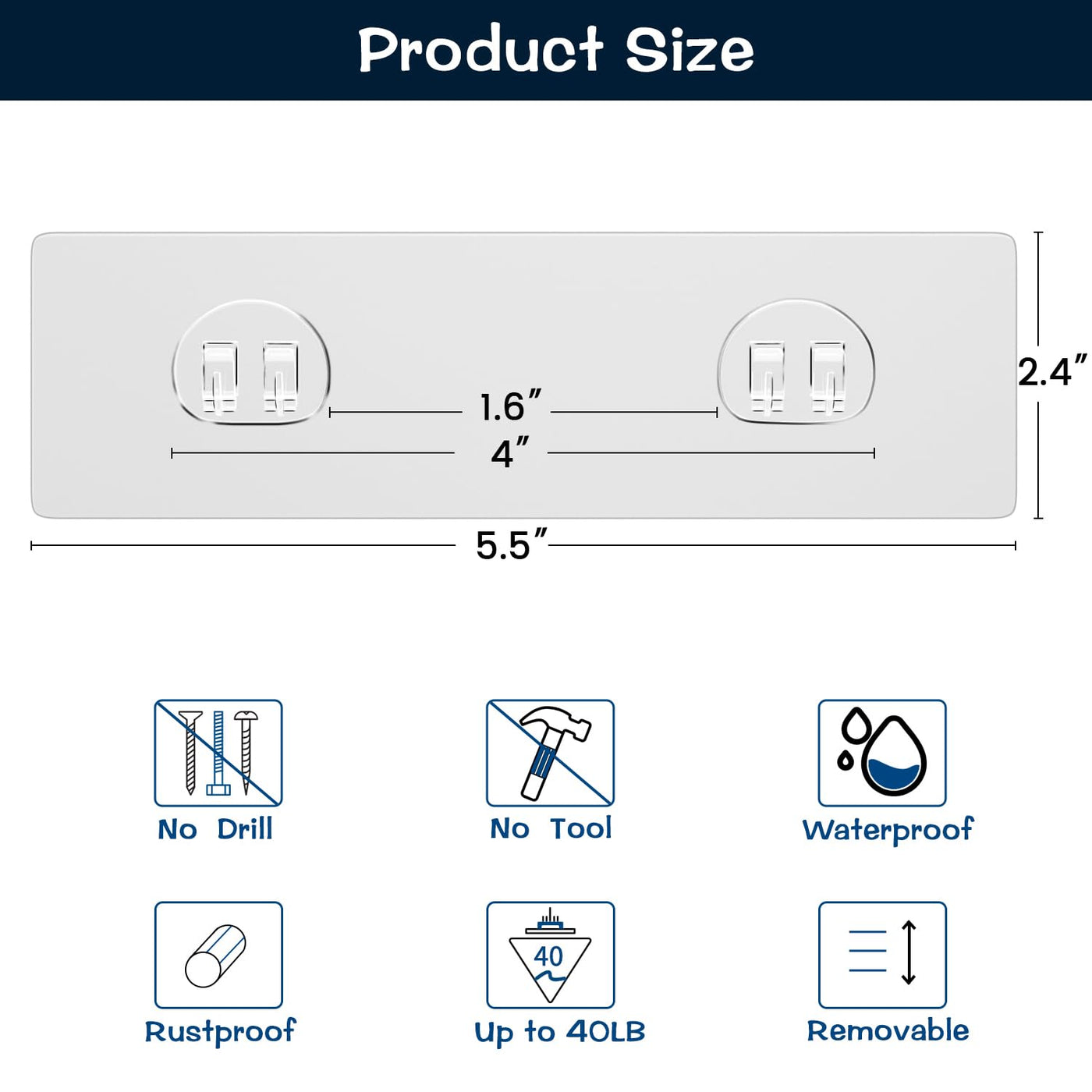 - Q: How much weight can the adhesive strips hold? A: The adhesive strips can hold up to 40 lbs, making them suitable for full-size bottles of shampoo, conditioner, body wash, and other shower essentials.