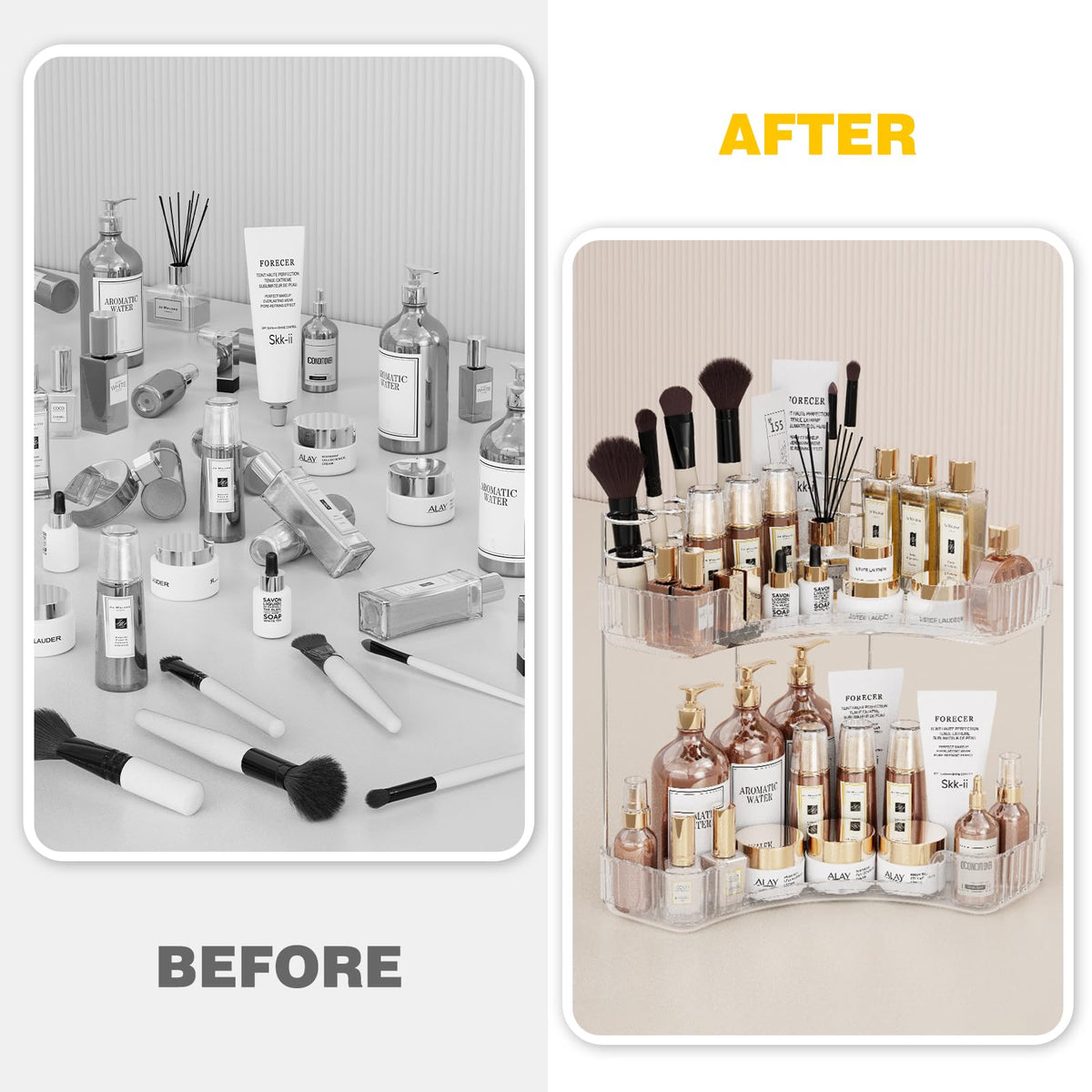 Asayuee 2-Tier Corner Bathroom Counter Organizer With Top Toothbrush Holders,Large Makeup Organizer Countertop With Brush Holder
