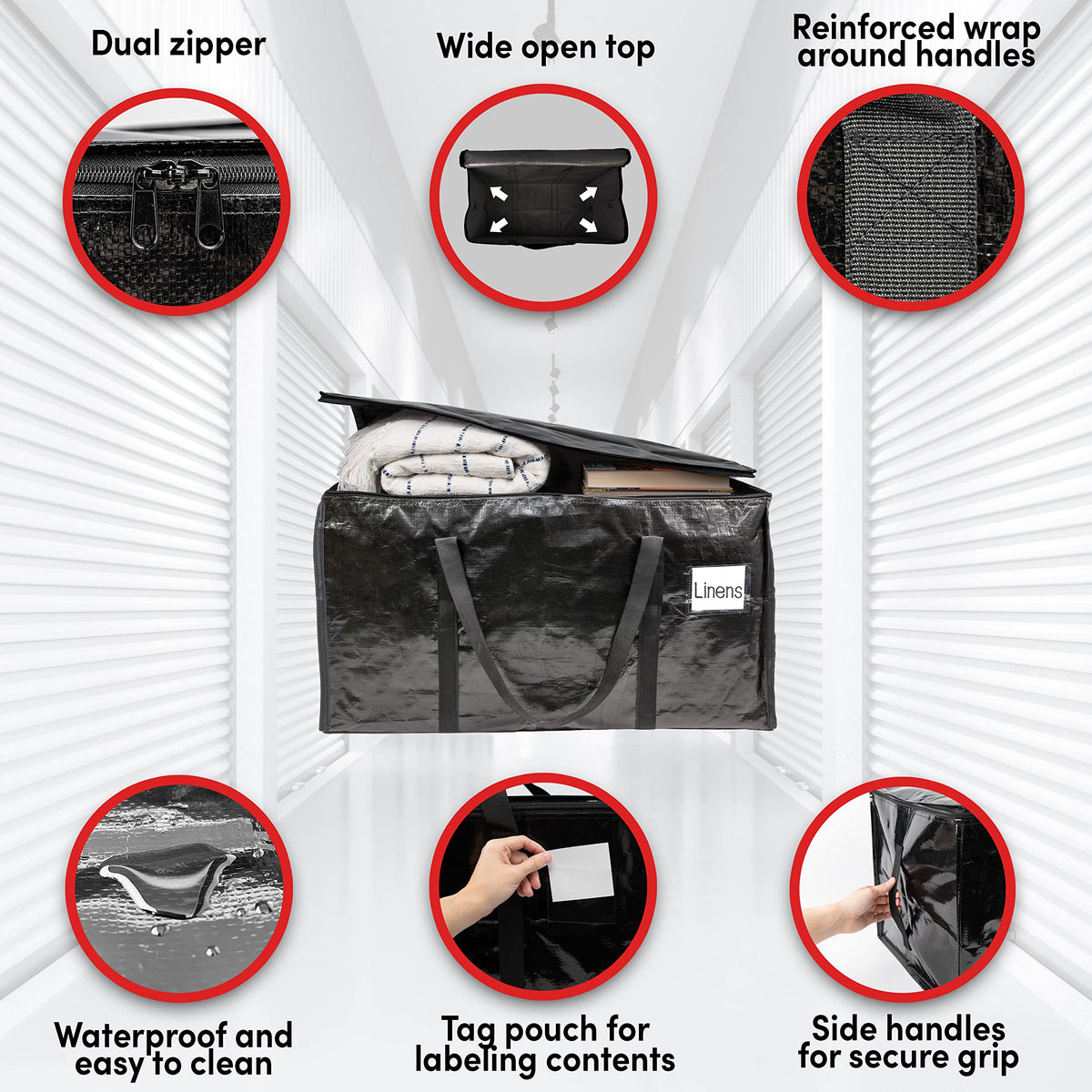 - Q: What type of zippers do these bags have? A: These moving bags feature heavy-duty dual zippers that create a wide-open top for easy loading and unloading, ensuring a secure closure for your items.