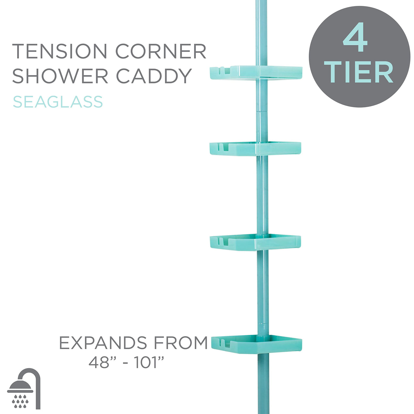 • Q: What are the dimensions of the Bath Bliss 4 Tier Tensions Corner Shower Caddy? A: The dimensions of the Bath Bliss 4 Tier Tensions Corner Shower Caddy are 5.91" x 5.91" and it is adjustable from 48" to 101".