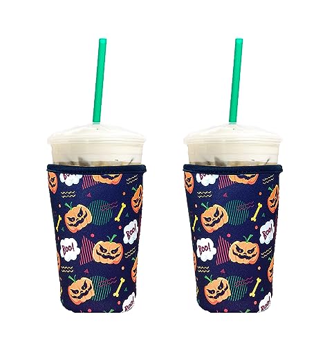 Baxendale Iced Coffee Sleeve Cups - 2 Pack - Neoprene Iced Coffee Sleeve - Medium 22-24Oz (Halloween Pumpkin)