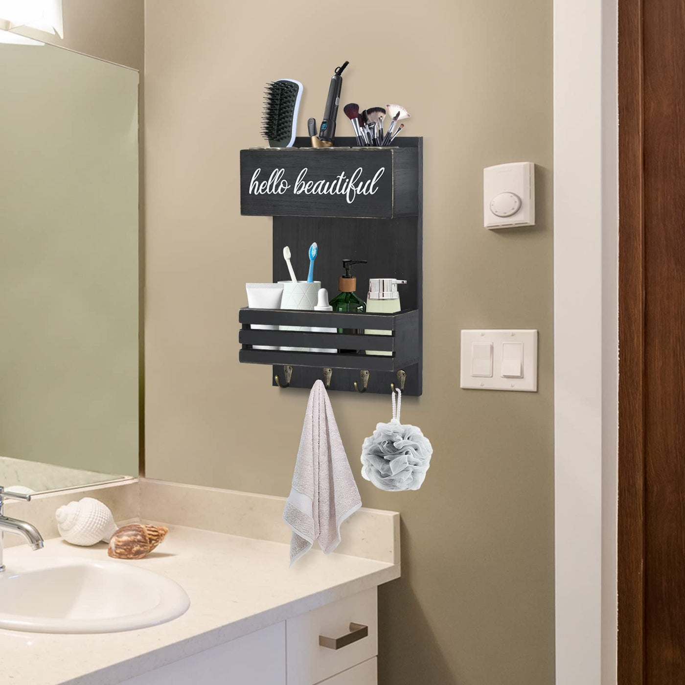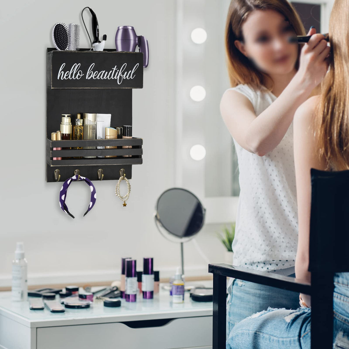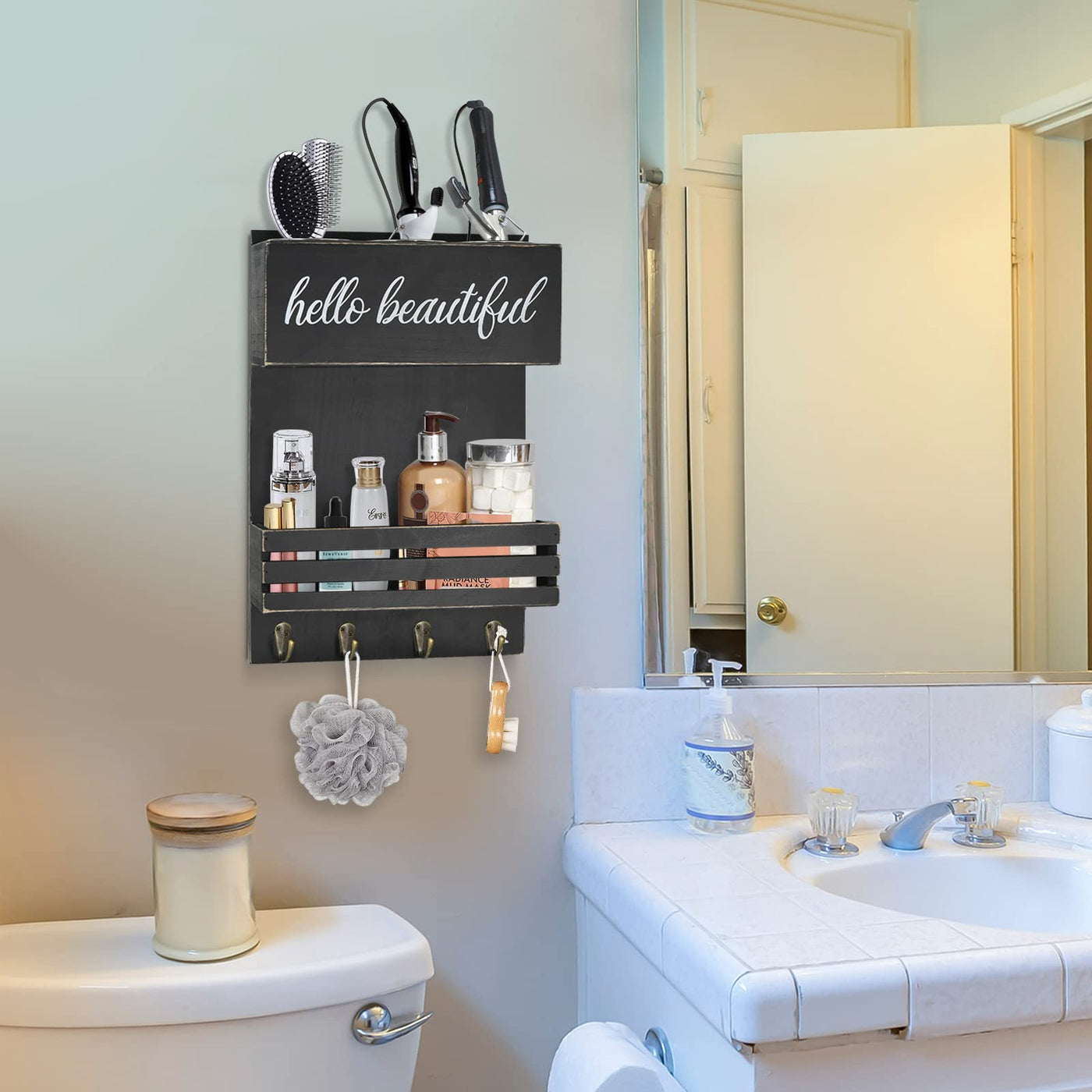 - Q: Is the design of the organizer customizable or available in different colors? A: Currently, the organizer features a rustic white finish with a 'HELLO BEAUTIFUL' saying and is not available in different colors.