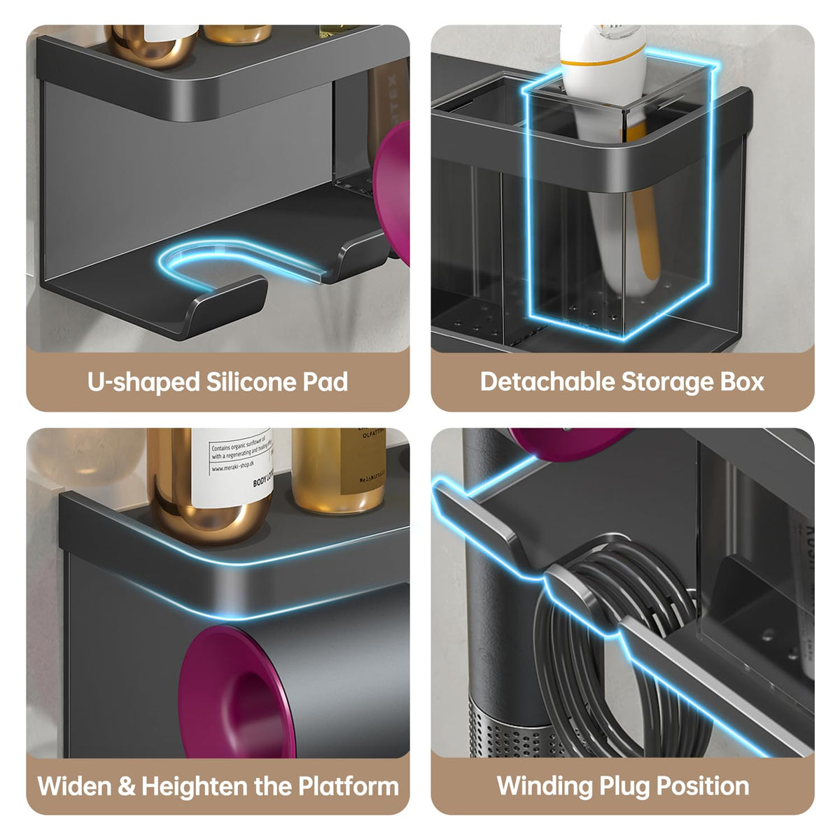 - Q: What are the dimensions of the hair dryer holder? A: The holder features an 8-inch platform for the hair dryer, with additional storage boxes that fit various personal care items.