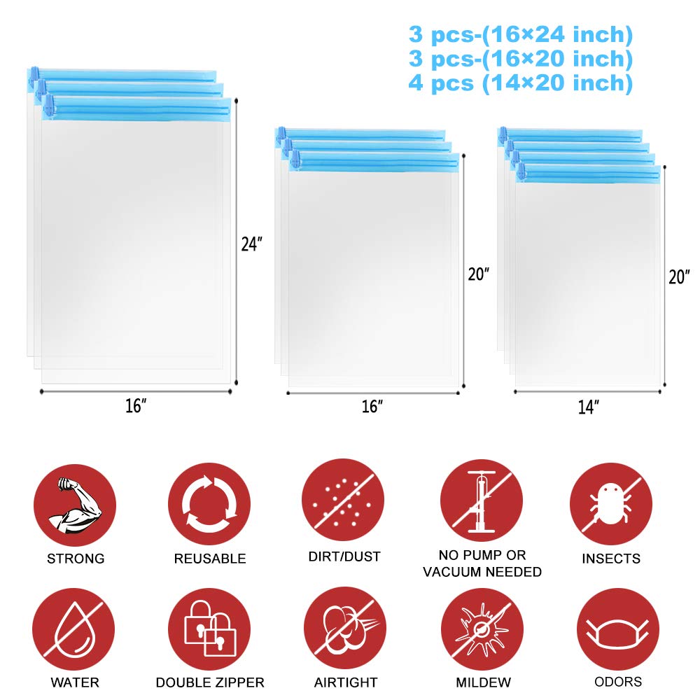 • Q: What are the dimensions of the compression bags in this pack? A: The pack includes three sizes: 4 Small bags measuring 20x14 inches, 3 Medium bags measuring 20x16 inches, and 3 Large bags measuring 24x16 inches.