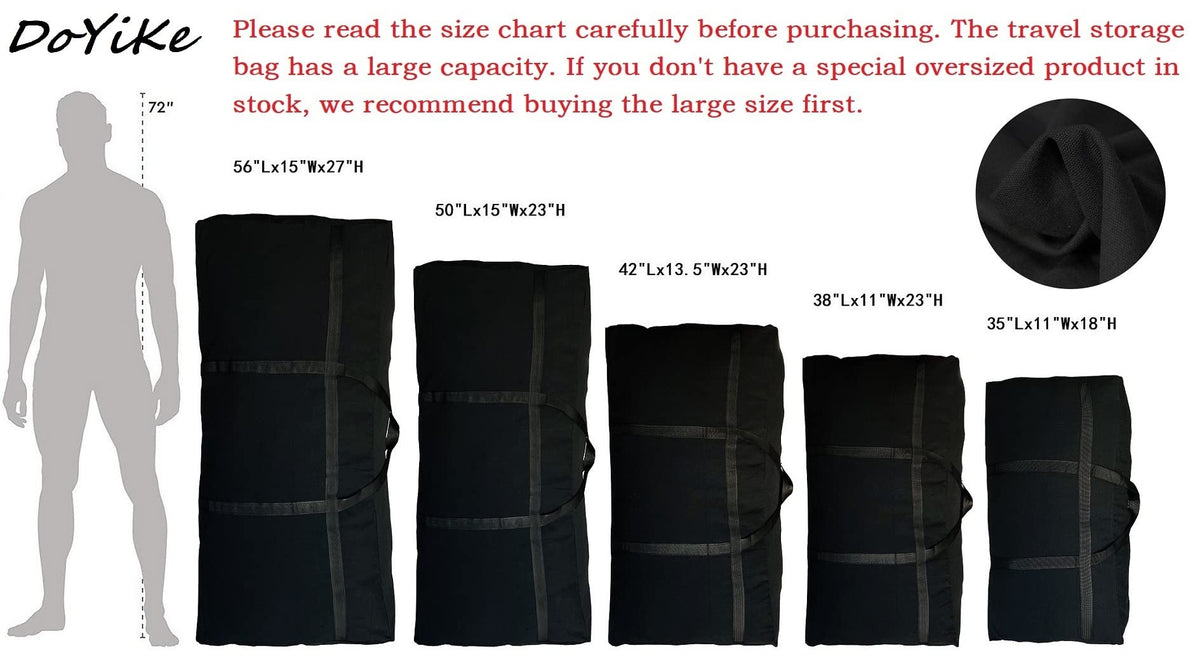 - Q: What are the dimensions of the DoYiKe Extra Large Canvas Storage Duffle Bag? A: The dimensions of the DoYiKe Extra Large Canvas Storage Duffle Bag are 56 inches long, 27 inches wide, and 15 inches high.