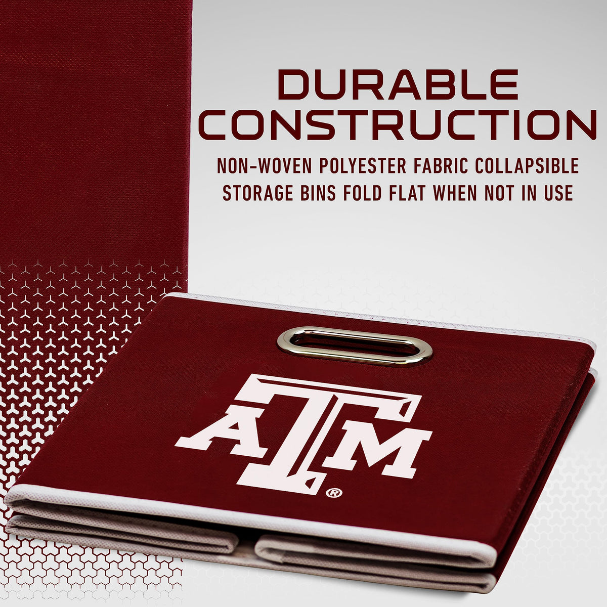 - Q: Does the storage bin feature team logos? A: Yes, the storage bin features the official logos and colors of the NCAA Texas A M Aggies.