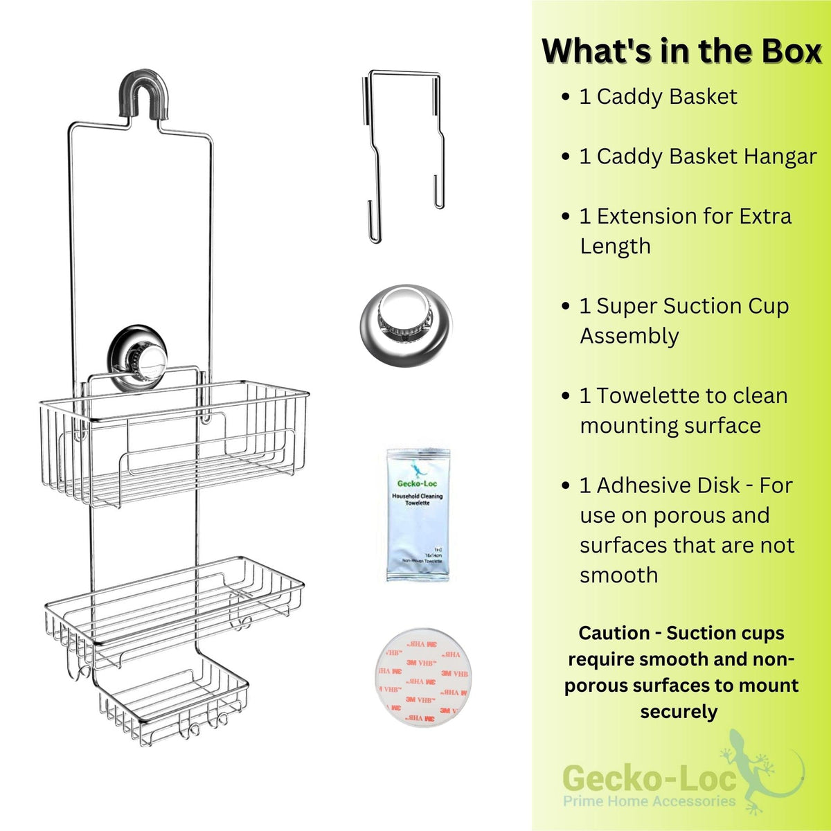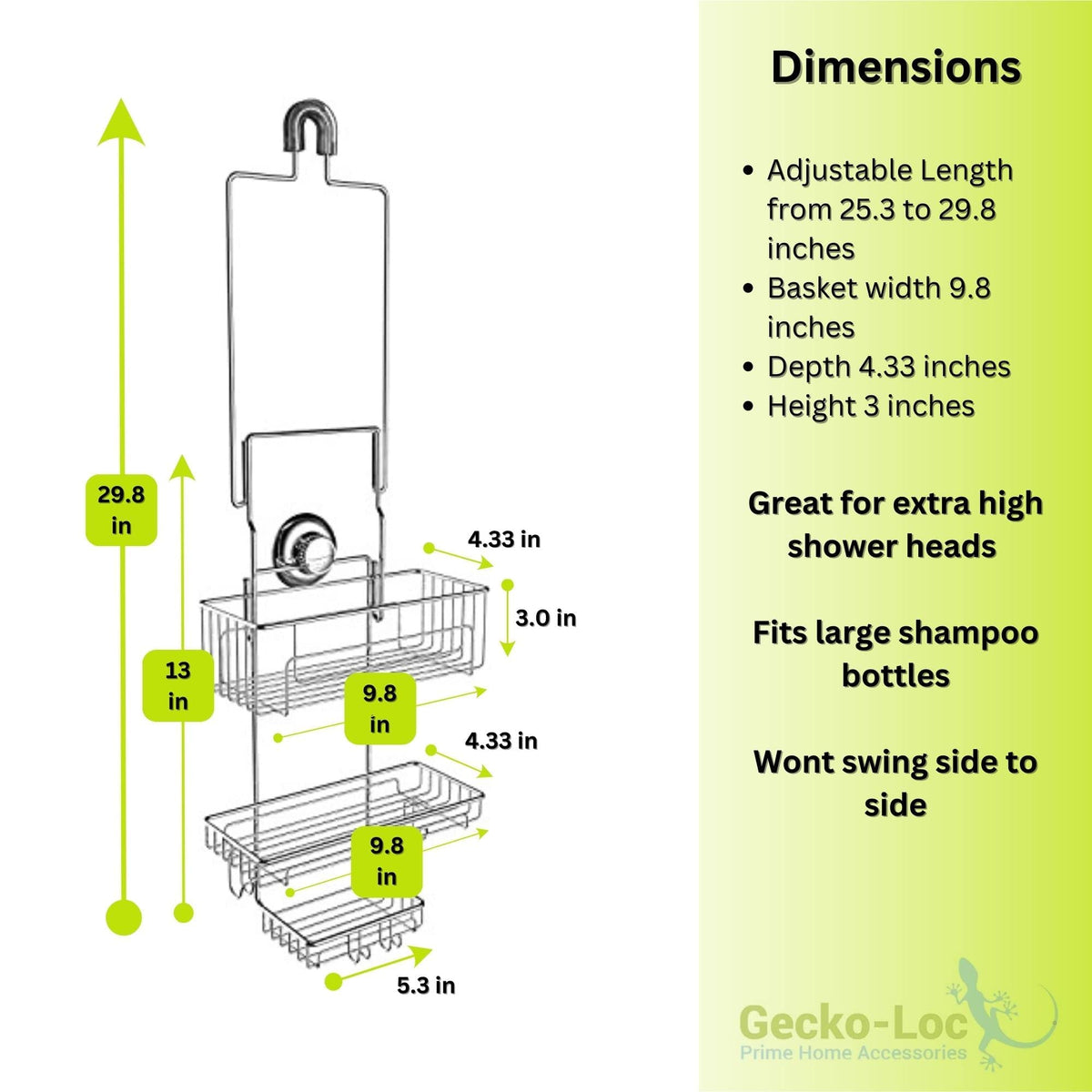 - Q: What is the overall design of the caddy? A: The Gecko-Loc SHS-015EXT features an extra-long design that extends to fit high showerheads, ensuring easy access to all your bathroom essentials.