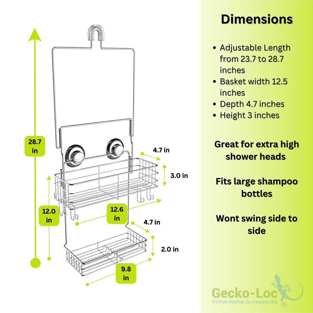 Gecko-Loc Extra Long Wide Adjustable Length Over The Showerhead Hanging Shower Caddy Organizer - Stainless Steel Bathroom Caddie