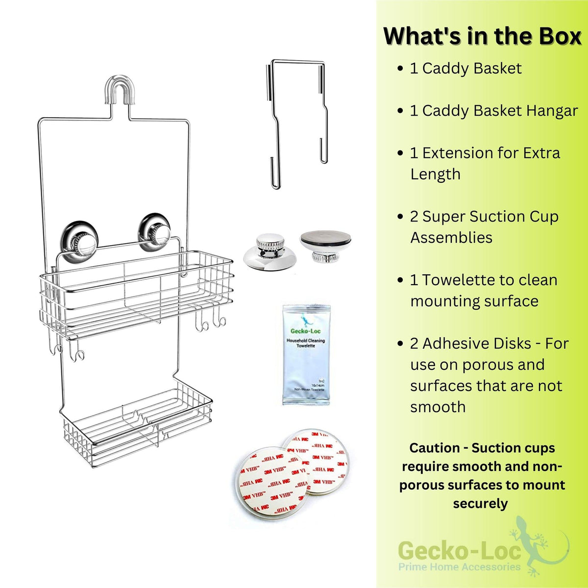 - Q: How does the suction cup work on the Gecko-Loc shower caddy? A: The suction cup on the Gecko-Loc shower caddy adheres to the shower wall to provide additional stability, helping to prevent movement or swaying, ensuring your items stay securely in place.
