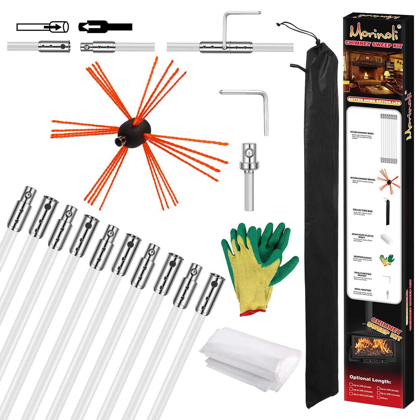 - Q: What is included in the Morinoli Chimney Sweep Kit? A: The Morinoli Chimney Sweep Kit includes 10 flexible rods measuring 3.3 feet each, a brush head, a drill adapter, a hex key, gloves, a sealing plastic sheet, and a storage bag.