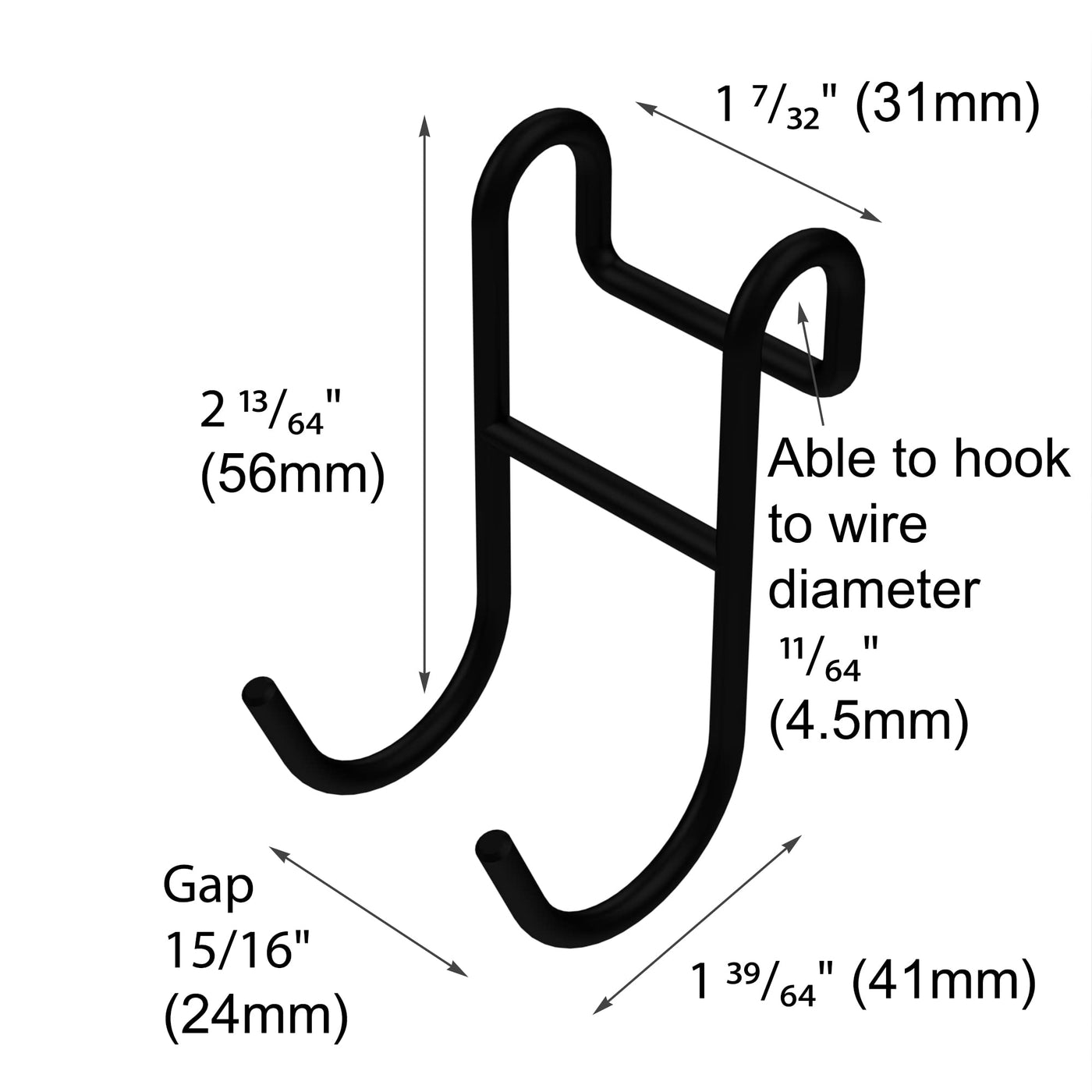 - Q: What are the dimensions of each hook? A: Each hook measures approximately 2 and 13/64 inches in height, 1 and 7/32 inches in width, and 1 and 39/64 inches in depth.