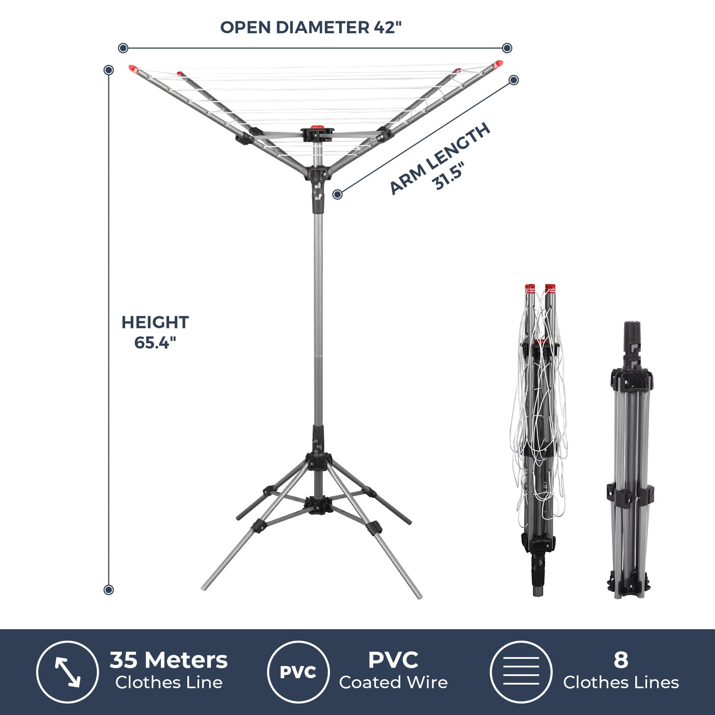 - Q: What are the dimensions of the STO STO Portable Umbrella Clothesline? A: The unfolded size of the clothesline is 42 inches in diameter by 42 inches in width and 65.4 inches in height.