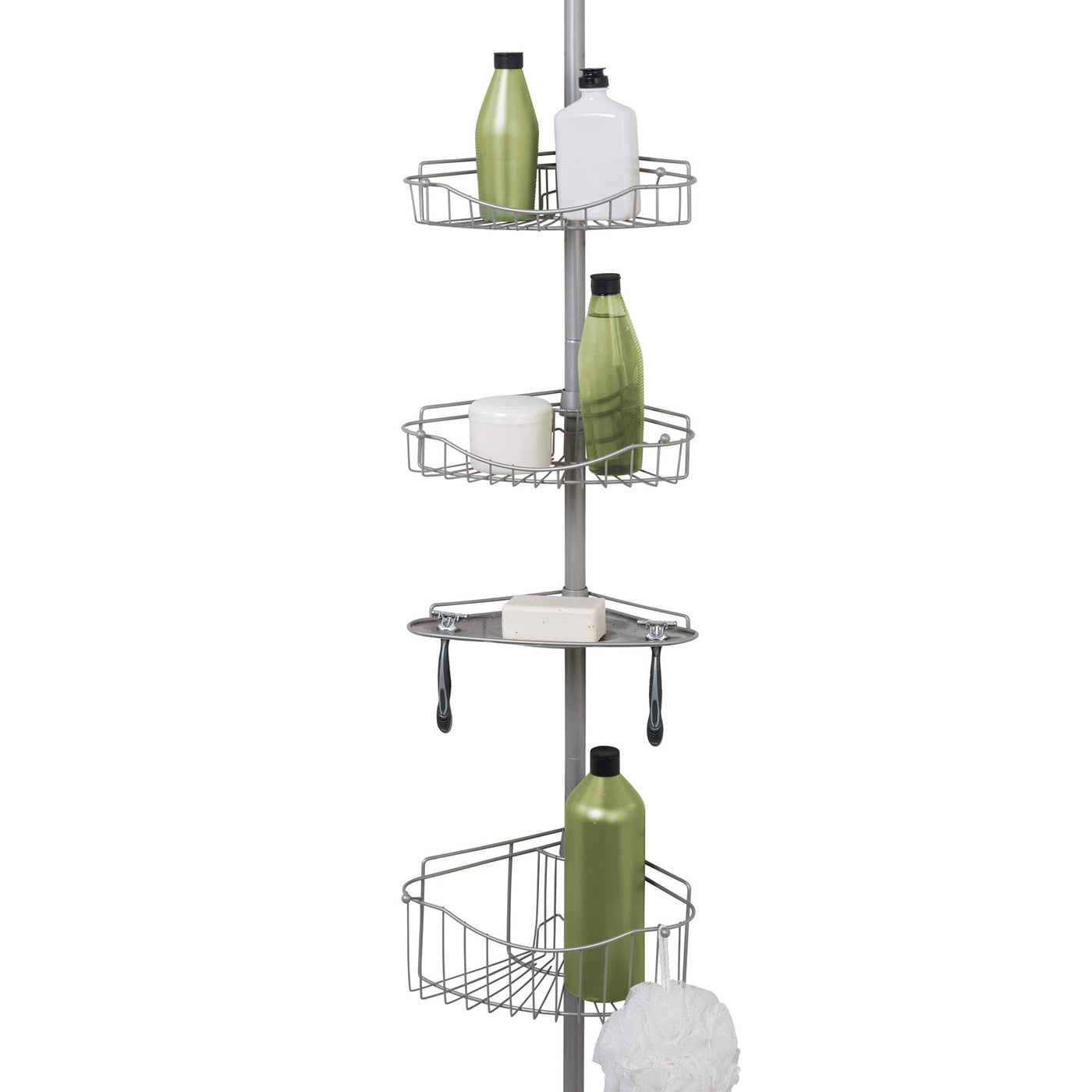 • Q: What finish does the Zenna Home Tension Pole Shower Caddy have? A: The caddy features a satin nickel finish, which is not only attractive but also rust-resistant.