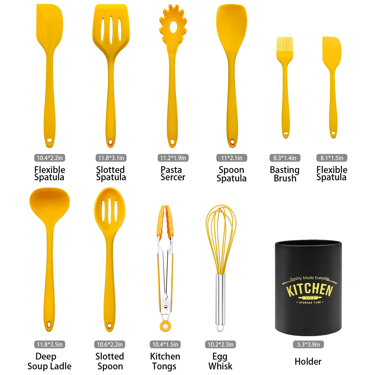 11 Piece Cooking Kitchen Utensils Set, Yellow Cooking Utensils Set, Non-Stick Silicone Spatula Set With Iron Utensils Holder, Si