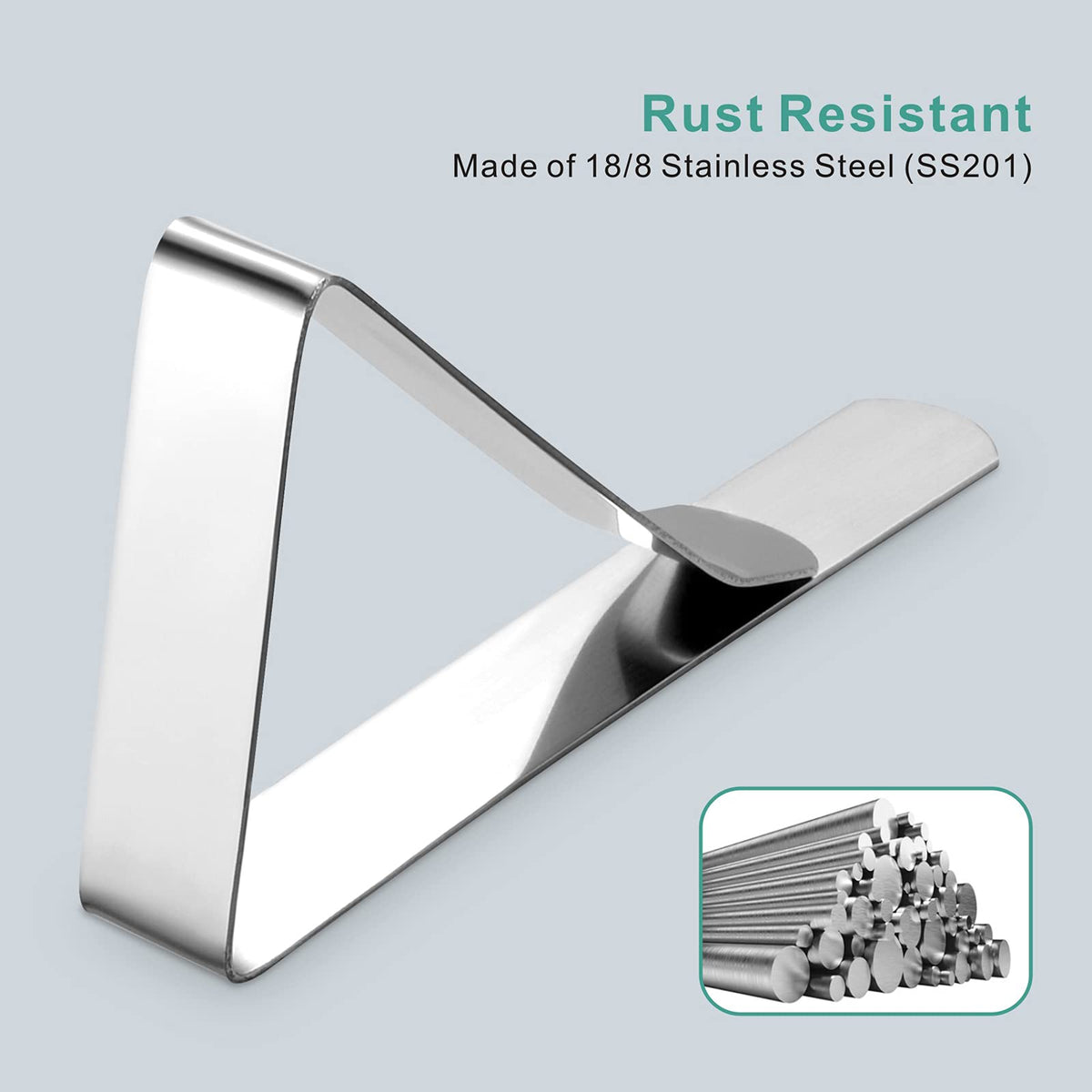 • Q: What material are the tablecloth clips made from? A: The tablecloth clips are made of high-quality #201 stainless steel, which is rust-proof and durable.