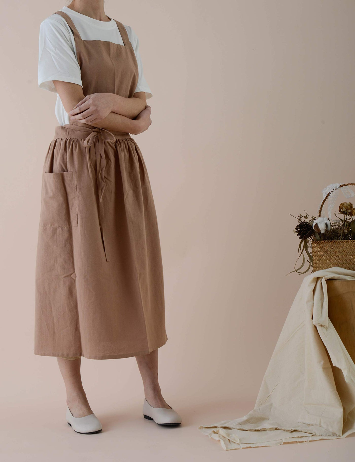 Faduofa Cotton Linen Apron Japanese Style Waterproof Aprons With Pockets For Kitchen Cafe Flower Shop Smock (Light Brown)
