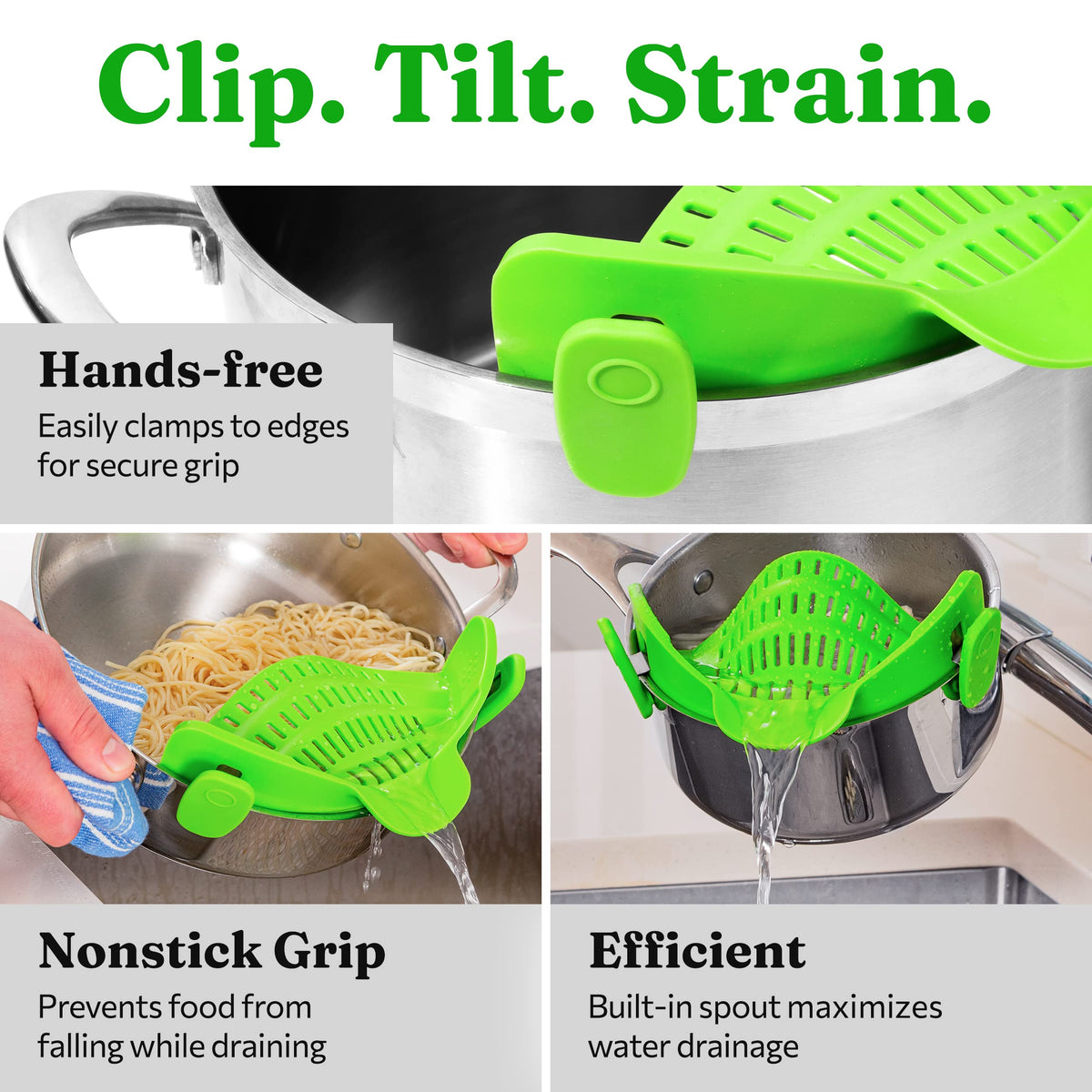 • Q: How does the clip-on strainer work? A: The clip-on strainer snaps onto the edges of pots, pans, or bowls, allowing you to strain pasta, vegetables, or meat hands-free without lifting a lid.