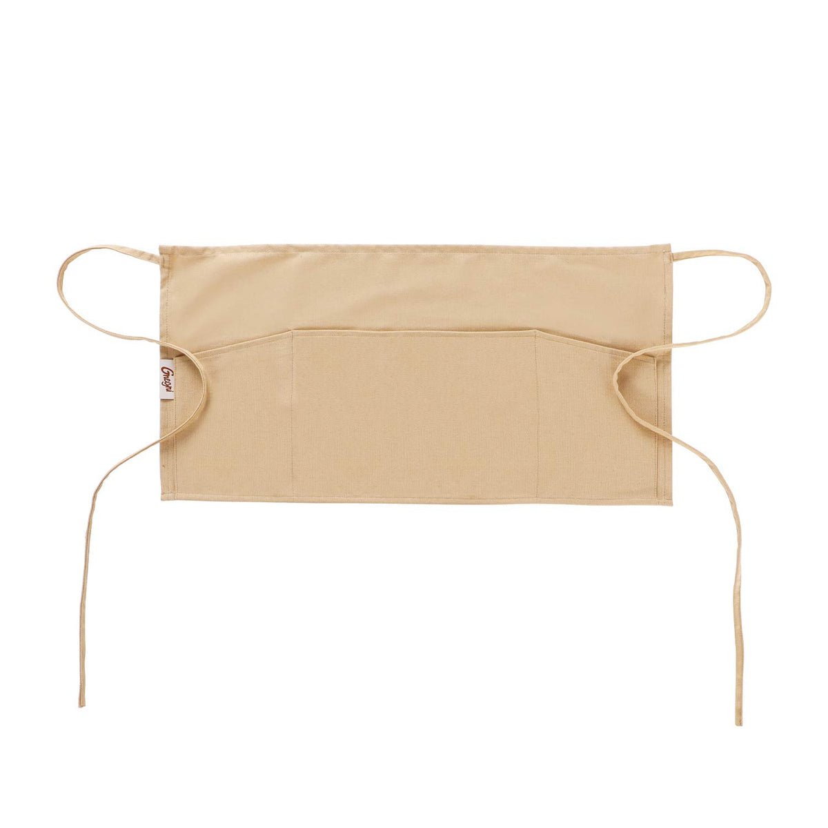 • Q: How many pockets does the waist apron have? A: The waist apron features three divided pockets: one large pocket in the middle and two slanted pockets on both sides.