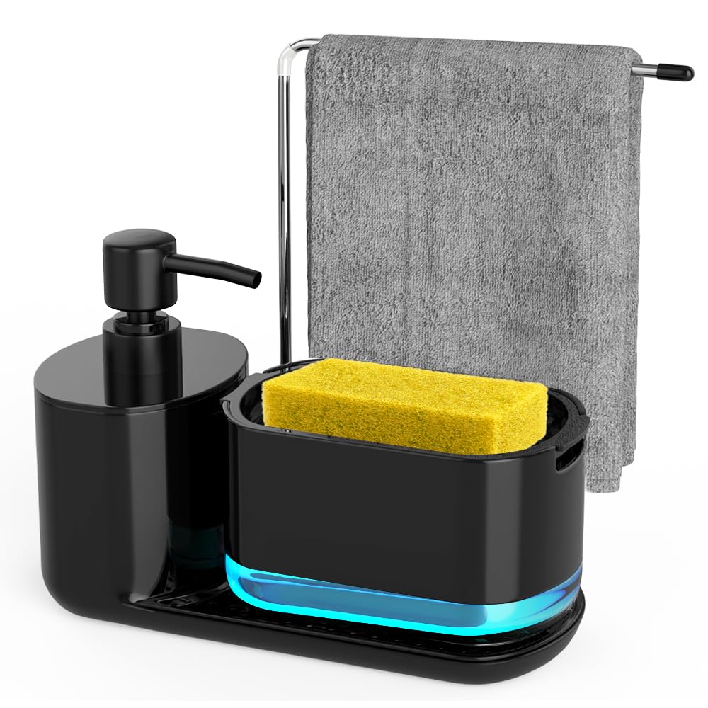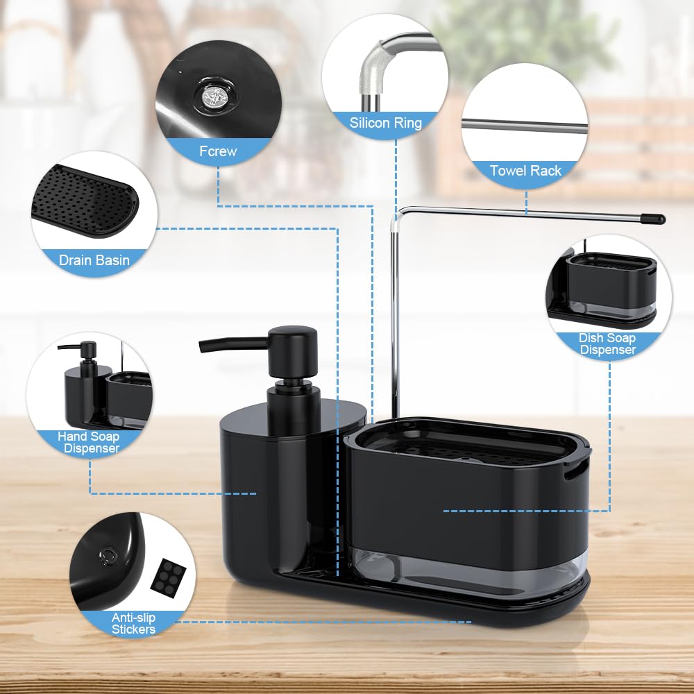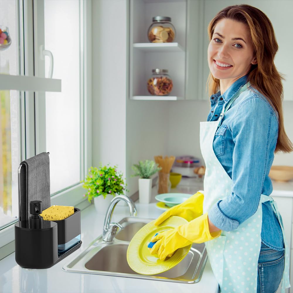 - Q: What does the 4-in-1 organizer include? A: The 4-in-1 organizer includes a hand soap dispenser, a dish soap dispenser, a sponge holder, and a drain tray, all designed to keep your kitchen neat and organized.
