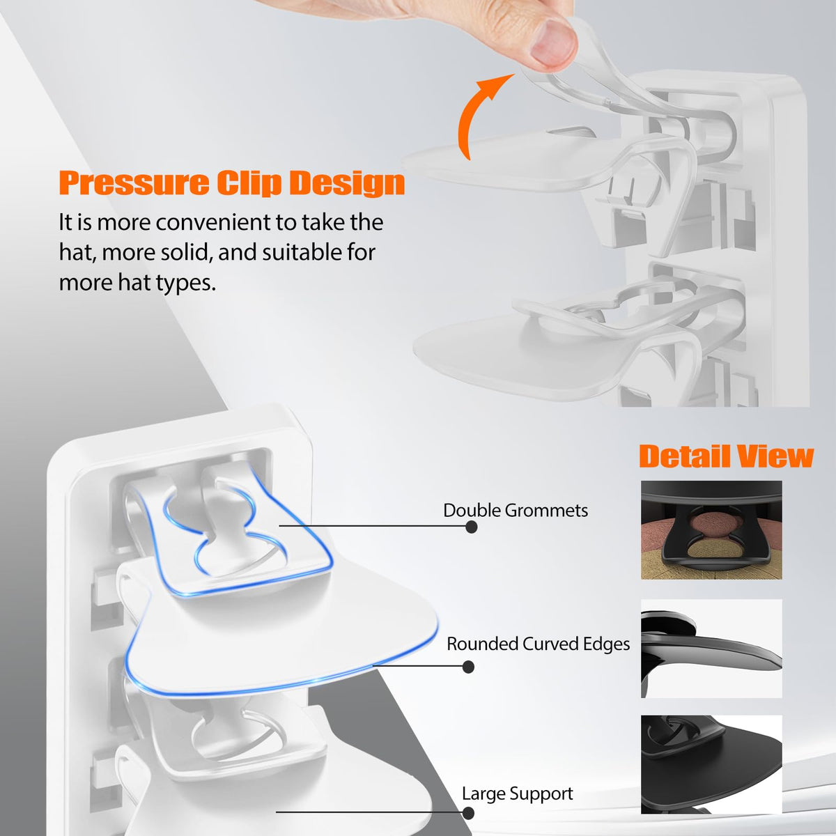 PATENTED CLIPS Our hat organizer has been awarded several U.S. Patents. Clips to button on top of cap. Hat rack is strong enough not to bend or break, better for long term use and more durable. | HATS NO LONGER FALL OFF! The hat organizer is designed with a press tongue.you can easily put in and take out without messing up other hats. The newly designed tongue depressor keeps the hat in place and won't fall off with a wild swing. Hat rack is uniquely layered so you don't have to remove all your hats for easy access. | PROTECTIVE CAP SHAPE Our hat organizer is no longer a simple slot! The curved support surface conforms perfectly to the shape of the hat, allowing each hat to avoid storage creases and sagging. Not only for hats with a top button, but also for soft hats without a button. You no longer have to worry about deformed hats or squishy stacks. | CENTRALIZED STORAGE Hat rack provides you with a compact and efficient solution for organizing a large number of baseball caps. The hat organizer displays your hat in an orderly and straight manner without taking up too much space. Hat racks can be mounted in walls, doors, or closets, allowing you to maximize vertical space and keep surfaces clean. | THE TWO MOUNTING Hat organizers are easy to set up. Hat racks come with a strong adhesive that makes them easy to mount without drilling holes, or you can choose screws if you prefer extra stability. Hat organizer for wall is split and removable, so you can also remove the hat racks to hide them when not in use. | Our products have obtained multiple U.S. patents.