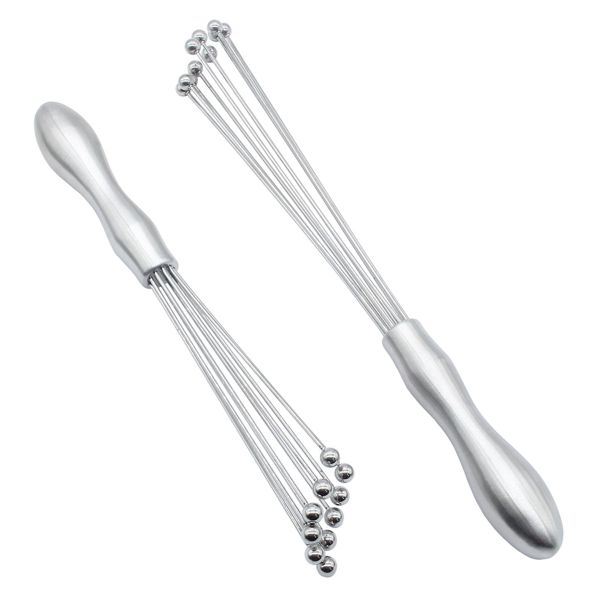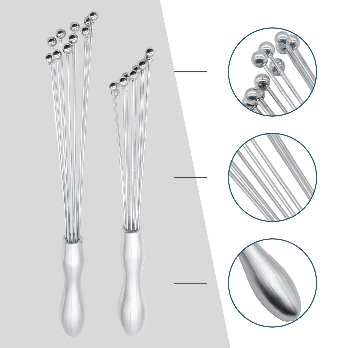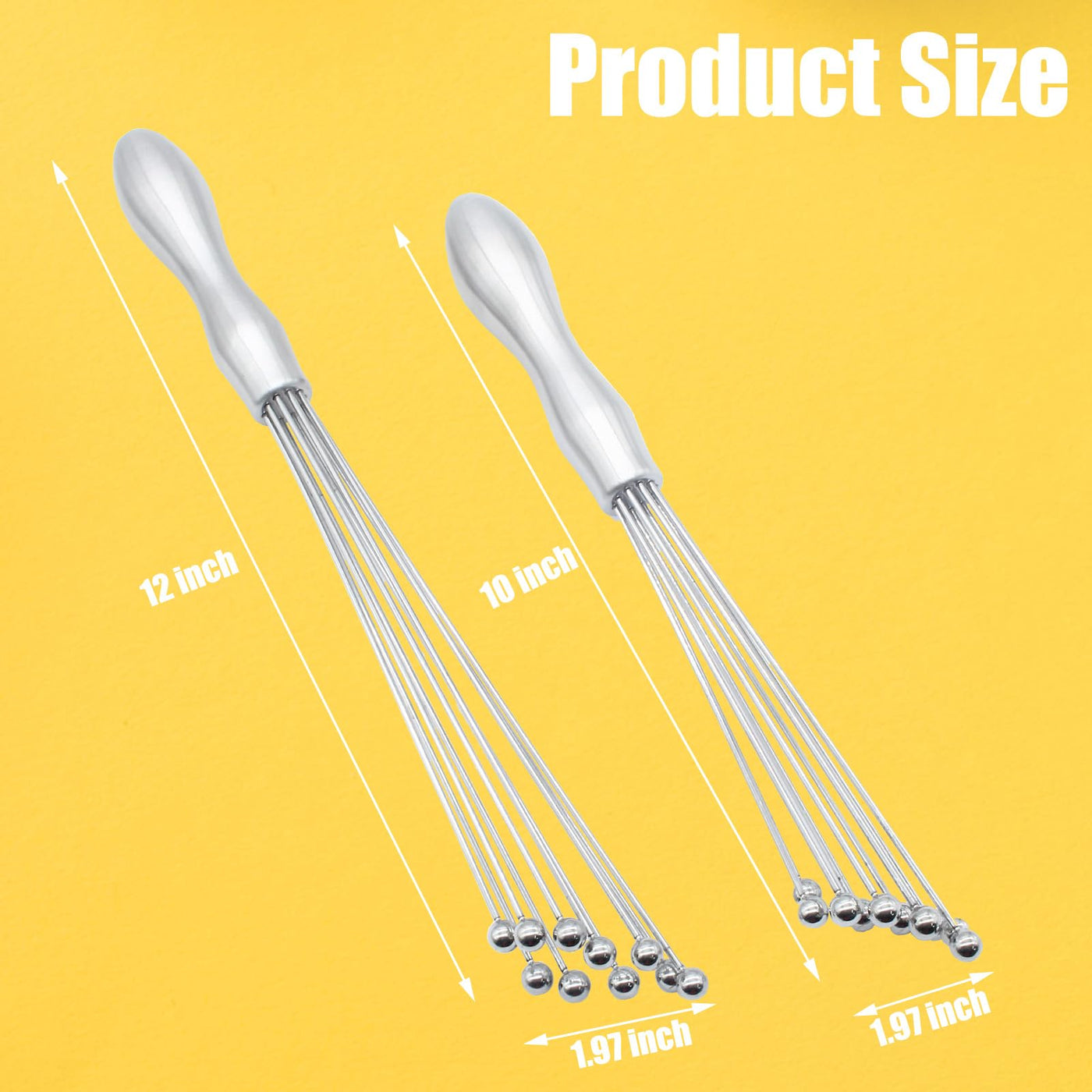 • Q: What are the dimensions of the whisks included in the package? A: The package includes two whisks: one measuring 10 inches and the other measuring 12 inches.