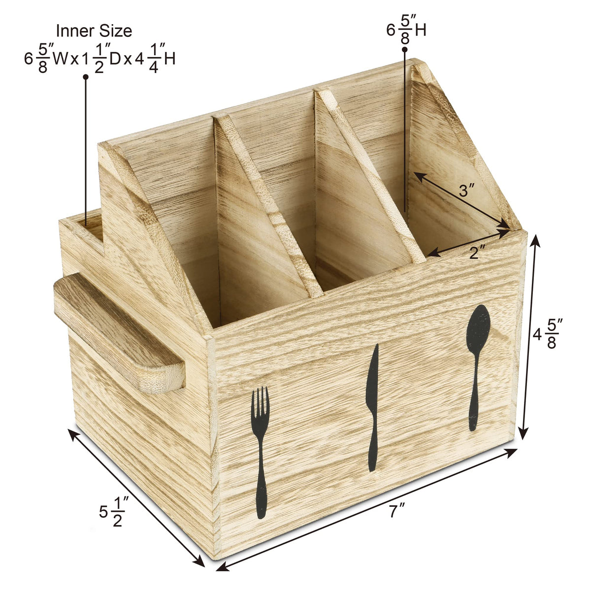 - Q: What are the dimensions of the Ikee Design Rustic Elegant Wooden Flatware Organizer Caddy? A: The dimensions of the Ikee Design Rustic Elegant Wooden Flatware Organizer Caddy are 7 inches wide, 5.5 inches deep, and 6.63 inches high.
