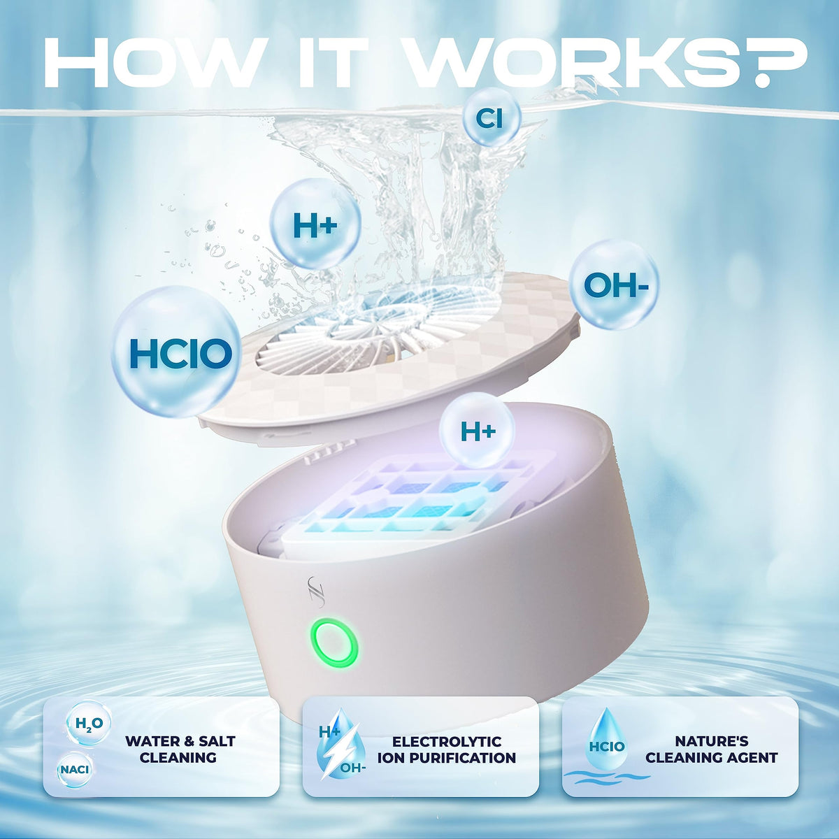 - Q: How does the cleaning process work? A: The device utilizes electrolysis to break apart water and salt molecules, creating hypochlorous acid, a natural cleaning agent that effectively sanitizes and disinfects without harmful chemicals.