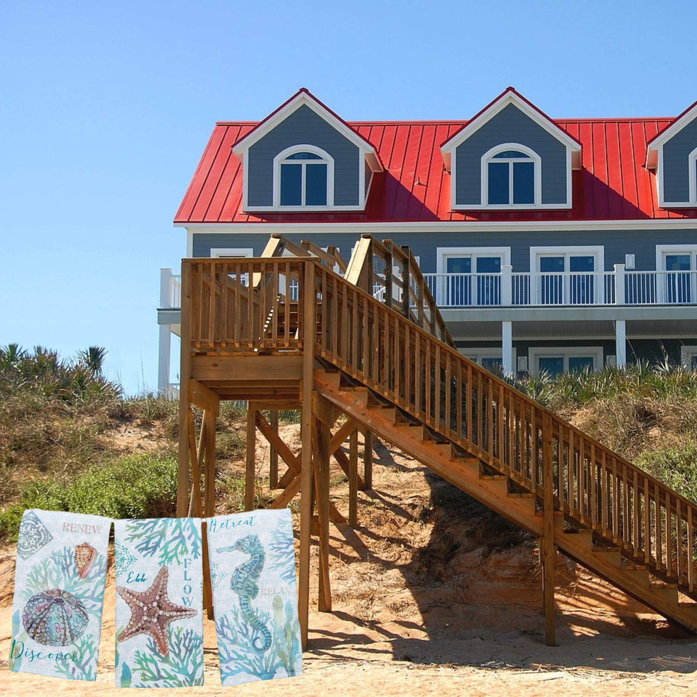 • Q: What designs are featured on the towels? A: The towels feature beautiful watercolor prints of ocean creatures, including a seahorse, starfish, and sea urchin.