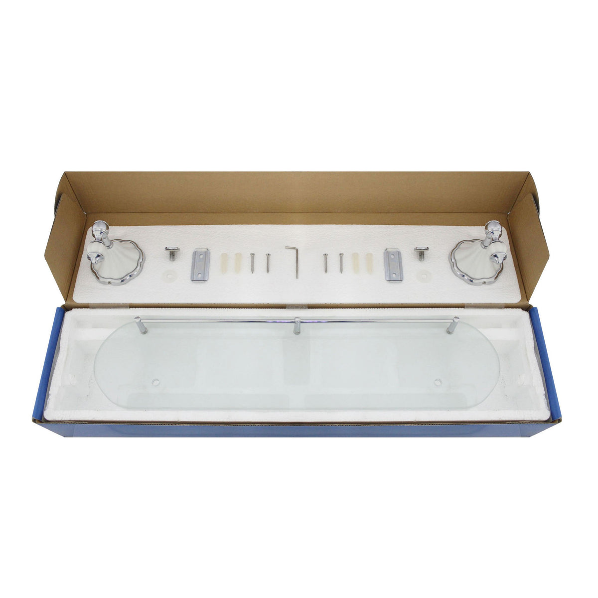 Modona 20'' Frosted Glass Shelf With Pre-Installed Rail - White Porcelain & Polished Chrome - Flora Series - 5 Year Warrantee