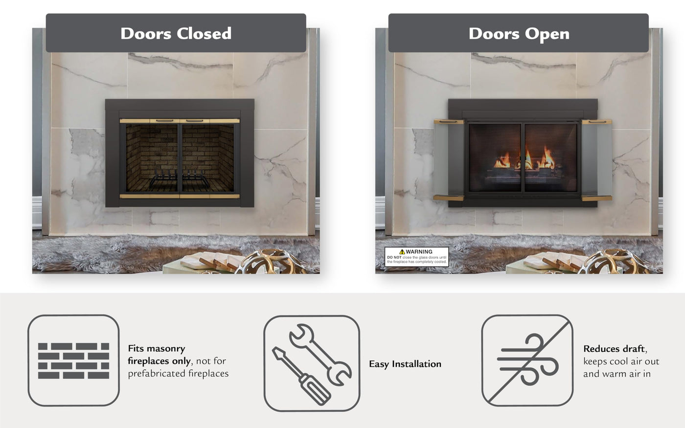 • Q: Are the doors of the Pleasant Hearth AR-1022 fireplace glass door easy to open? A: Yes, the doors of the Pleasant Hearth AR-1022 fireplace glass door open completely for a full view of the fireplace.