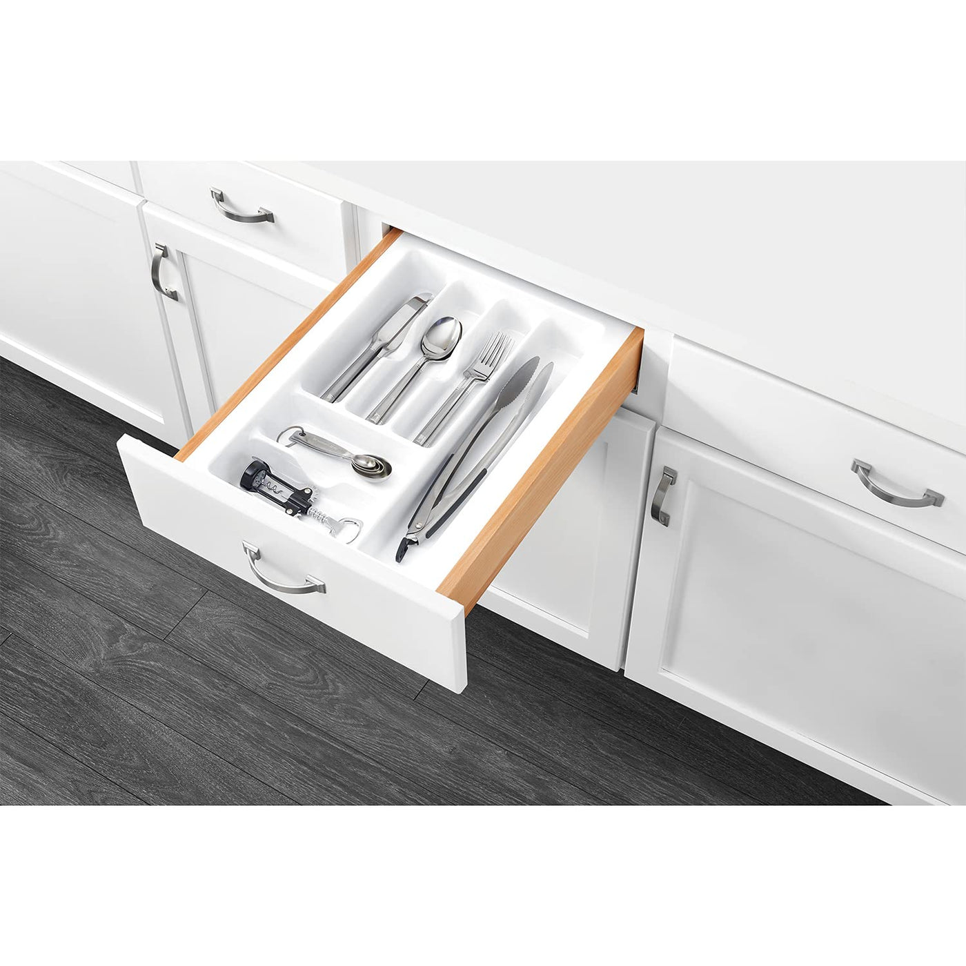 • Q: Can this tray hold large kitchen utensils? A: Yes, the cutlery tray is designed to organize various kitchen utensils, including larger items, depending on how you configure the tray.