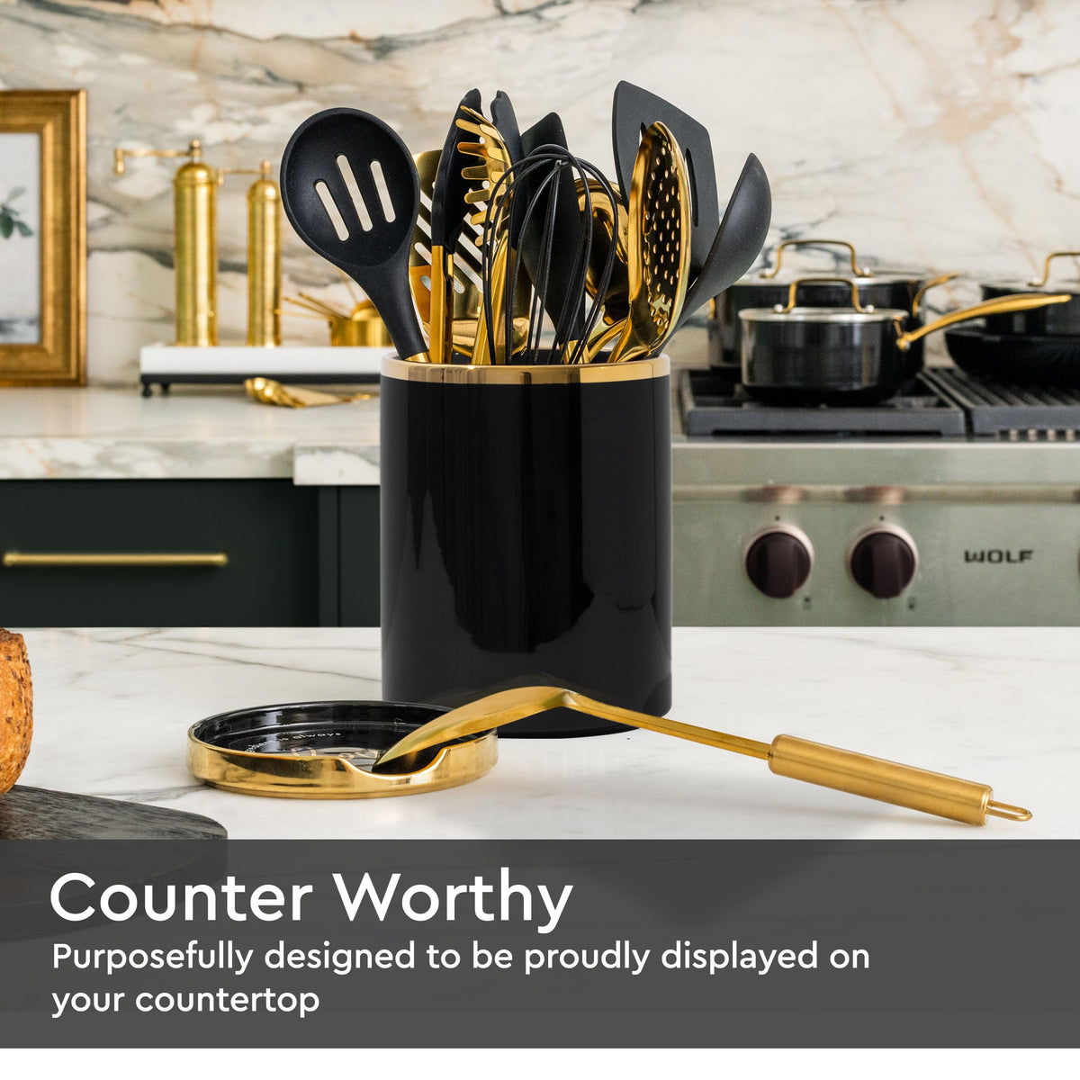 Styled Settings Black And Gold Utensil Holder With Built-In Spoon Rest - 2 Pc Large Ceramic Utensil Holder Includes Black & Gold