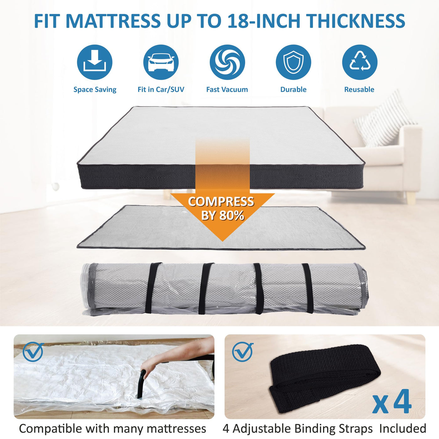 • Q: How much can I compress my mattress with this vacuum bag? A: You can compress your mattress by up to 80%, significantly reducing its size for easier transportation and storage.
