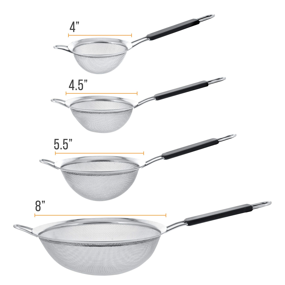 U.S. Kitchen Supply - Set Of 4 Premium Quality Fine Mesh Stainless Steel Strainers With Comfortable Non Slip Handles - 4'', 4.5'
