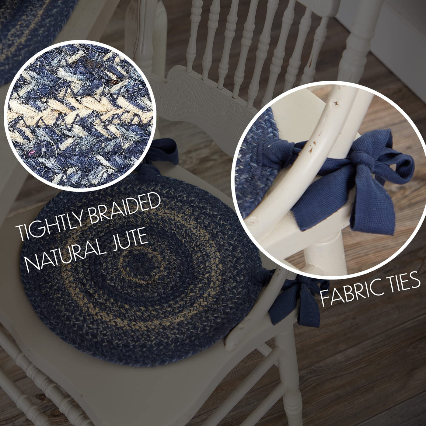 Vhc Brands Great Falls Blue Round Seat Cushion Chair Pad, Blue White, Jute Blend With Ties, 15X15 Inches