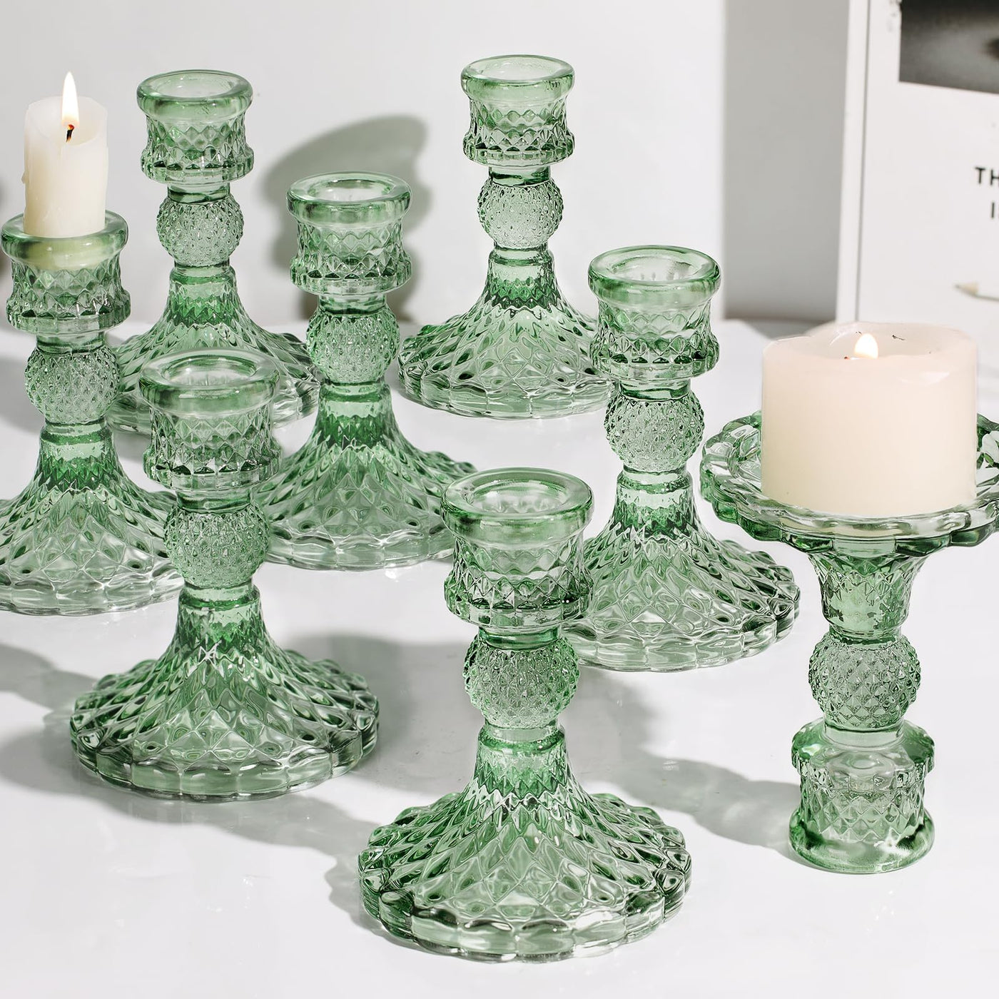 12Pcs Green Candlestick Holders Set- 4 H Taper Candle Holders Bulk, Glass Candle Holders for Wedding, Party, Romantic Dinner Tab
