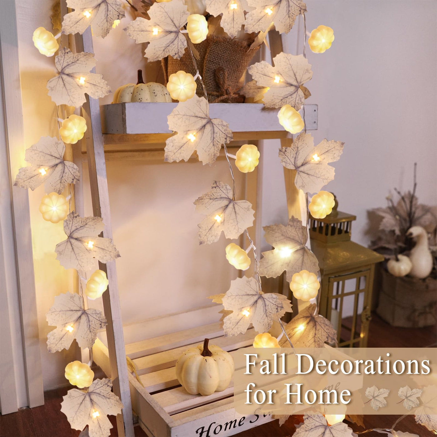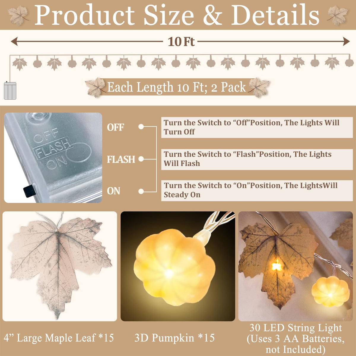 ?Product Specification?Size: Fall garland: 10 Ft / 3 m (L)Pumpkin: 0.9 * 0.4 inch (D*H)Maples leaf: 4 * 4 inch (L*W)Element: neutral maples leaf *15, pumpkin *15Color: light brown, whiteMaterial: plasticLight color: warm whiteLight quantity: 30 LED (2 pack totally 60 LED)Lighting mode: steady on, flashingPower supply: 3 AA batteries (not included)Applicable occasions: fireplace, door, dining table, porch, window, stairs, living room, bedroom, patio, store, bar, fall Thanksgiving celebration?Package Includes?10 Ft Neutral Fall Garland *2