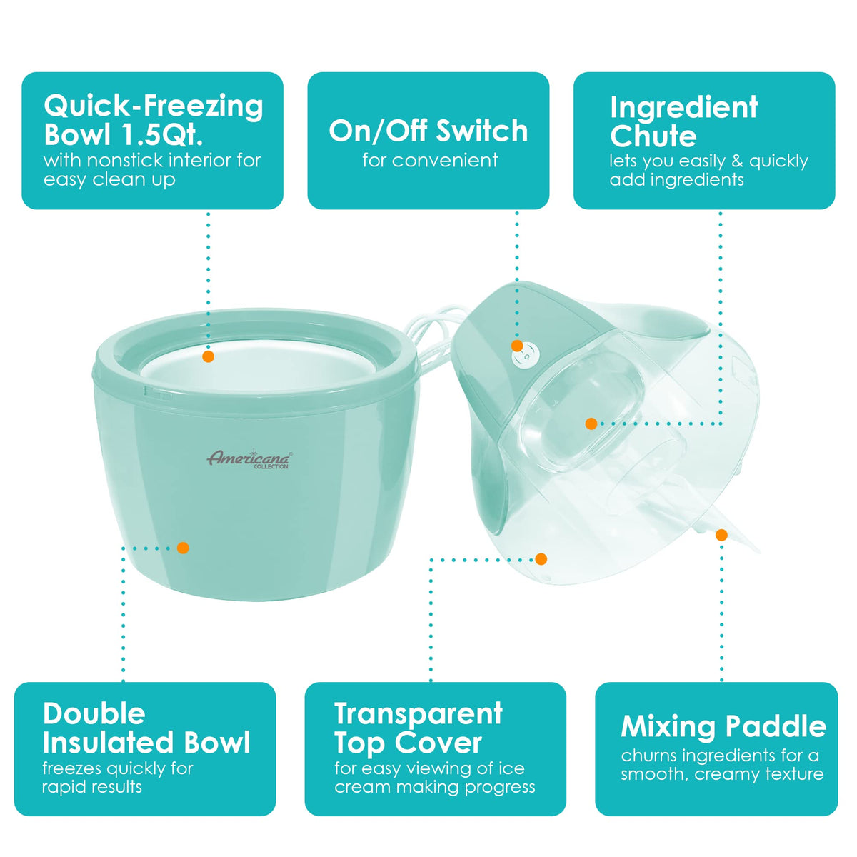 - Q: What makes this ice cream maker different from others? A: The Americana ice cream maker features a quick freeze bowl and a powerful motorized paddle, making the ice cream-making process fast and enjoyable.