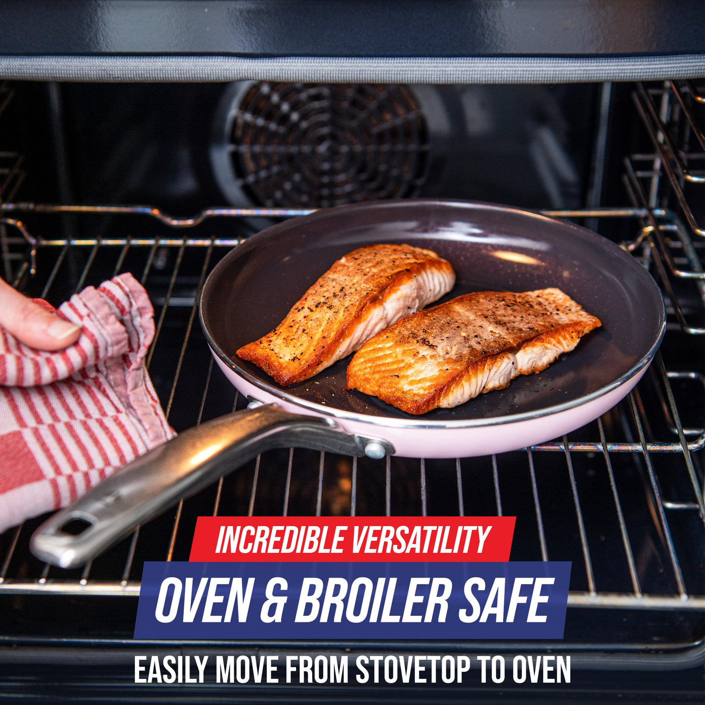 - Q: Can I use the Blue Diamond frying pan in the oven? A: Yes, the Blue Diamond frying pan is oven and broiler safe up to 600°F, allowing for versatile cooking options.