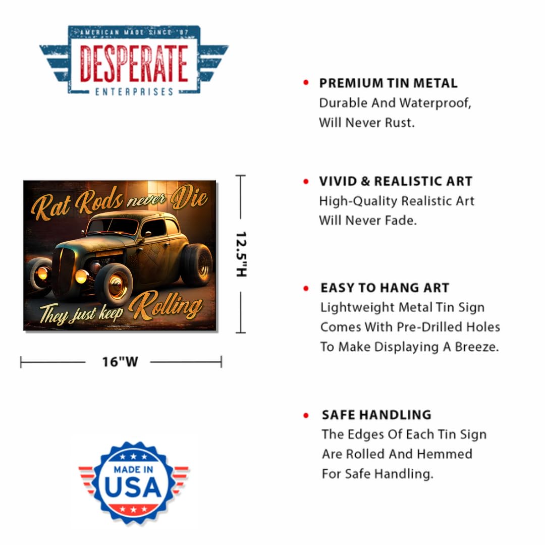 Desperate Enterprises Rat Rods Never Die Tin Sign - Garage Signs - Nostalgic Vintage Metal Signs - Made in the USA