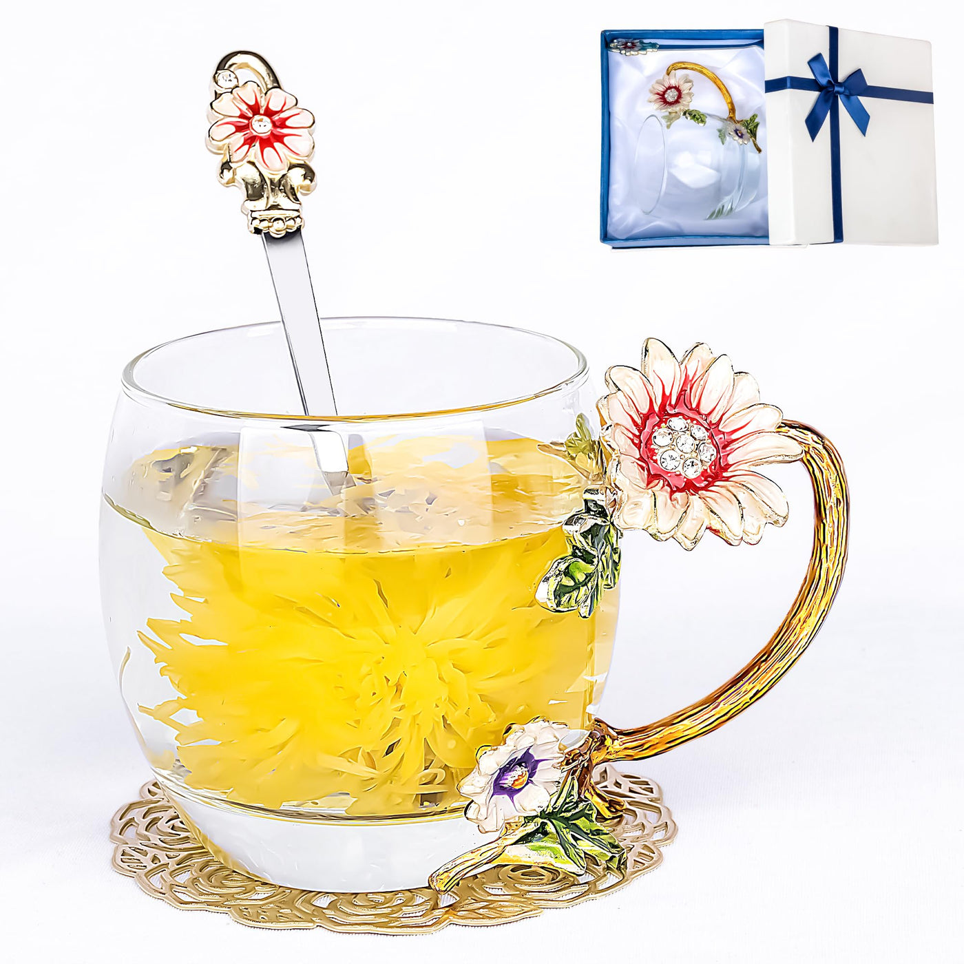 Flower Tea Cup,Butterfly Daisy Glass Fancy Coffee Mug with Spoon,Gift Box for Her Mom Wife Grandma Girls Friends Valentines Chri