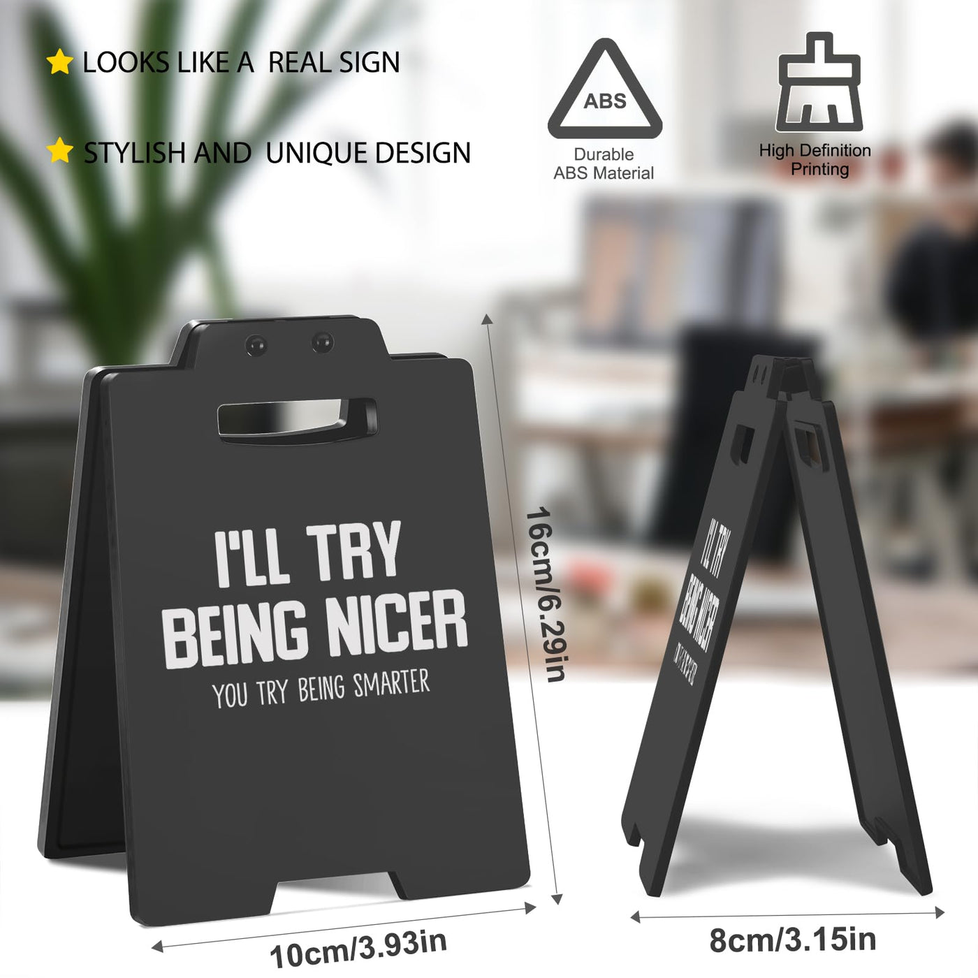 If youre someone who loves a little humor at work, this I'LL TRY BEING NICER, YOU TRY BEING SMARTER desk sign is the perfect addition to your workspace. Its ideal for those who appreciate sarcasm and playful banter, making it a great gift for coworkers, team members, or bosses who could use a good laugh. Perfect for decorating your desk, cubicle, or home office, this sign offers the right blend of humor and motivation to keep things light and fun. Whether you're working from home or in the office, this sign is sure to be the talk of the room.