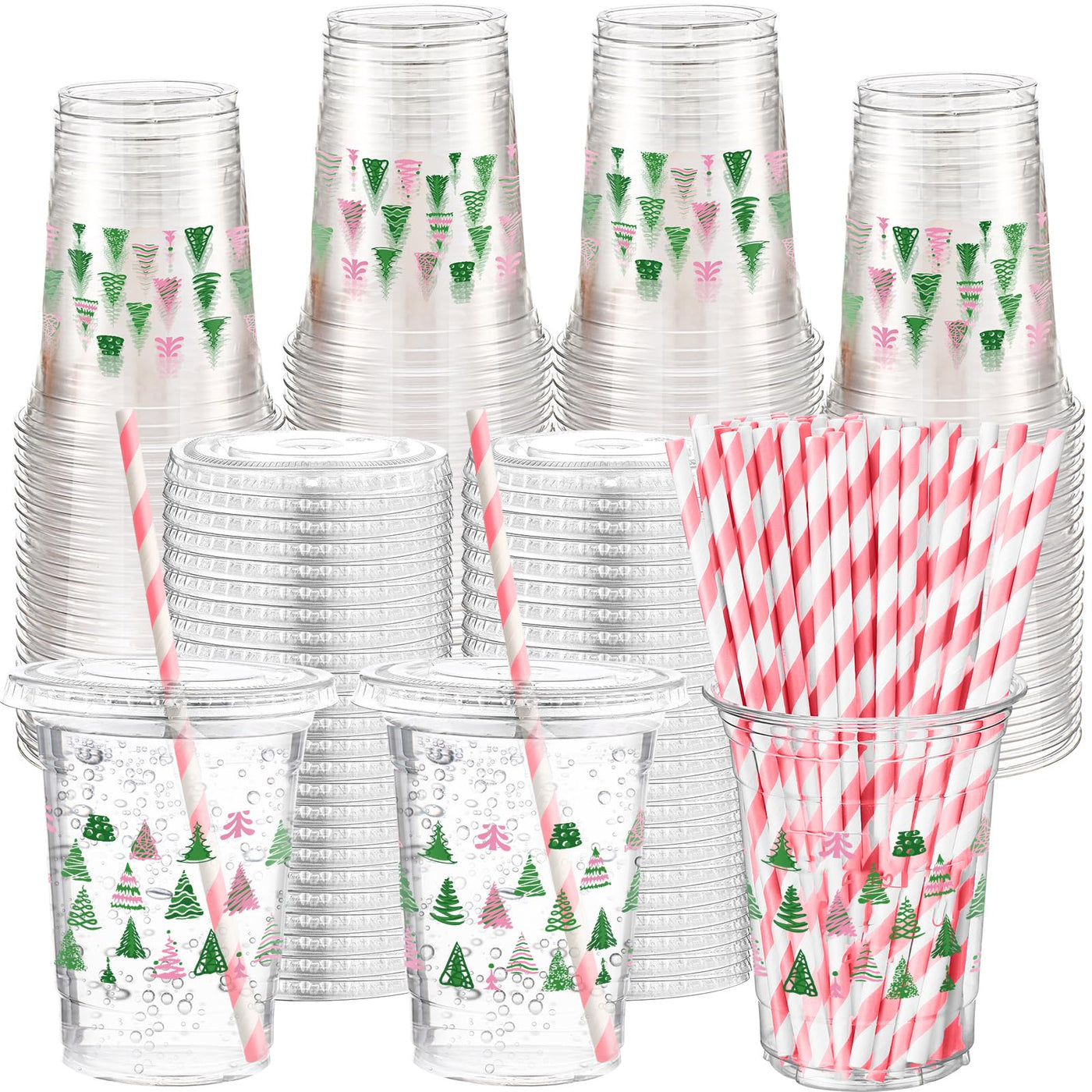 Funnymoom 50 Sets Christmas Disposable Plastic Cups Bulk with Lids Straws 16 oz Pink Green Xmas Tree Plastic Cups Cold Beverage