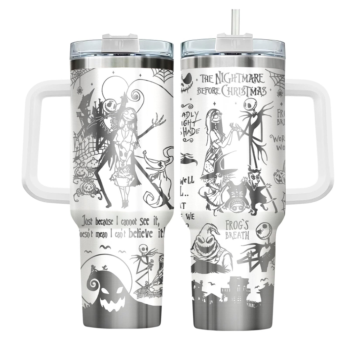 GEPOSTORE Spooky Christmas Tumbler - 40 oz Laser Stainless Steel Mug with Handle - Nightmare Halloween Movie Cup Gift for Fans o