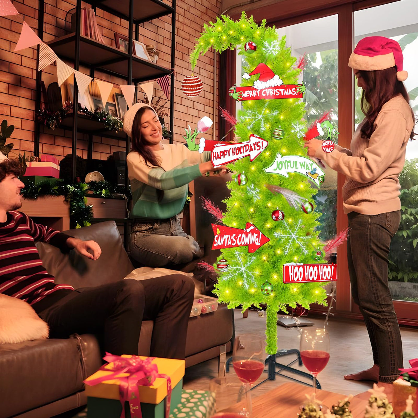 Grinchs Christmas Tree 6FT, Whimsical Bendable Artificial Tree, Lime Green Design with Tree Skirt & Red Ball Ornament, Christmas