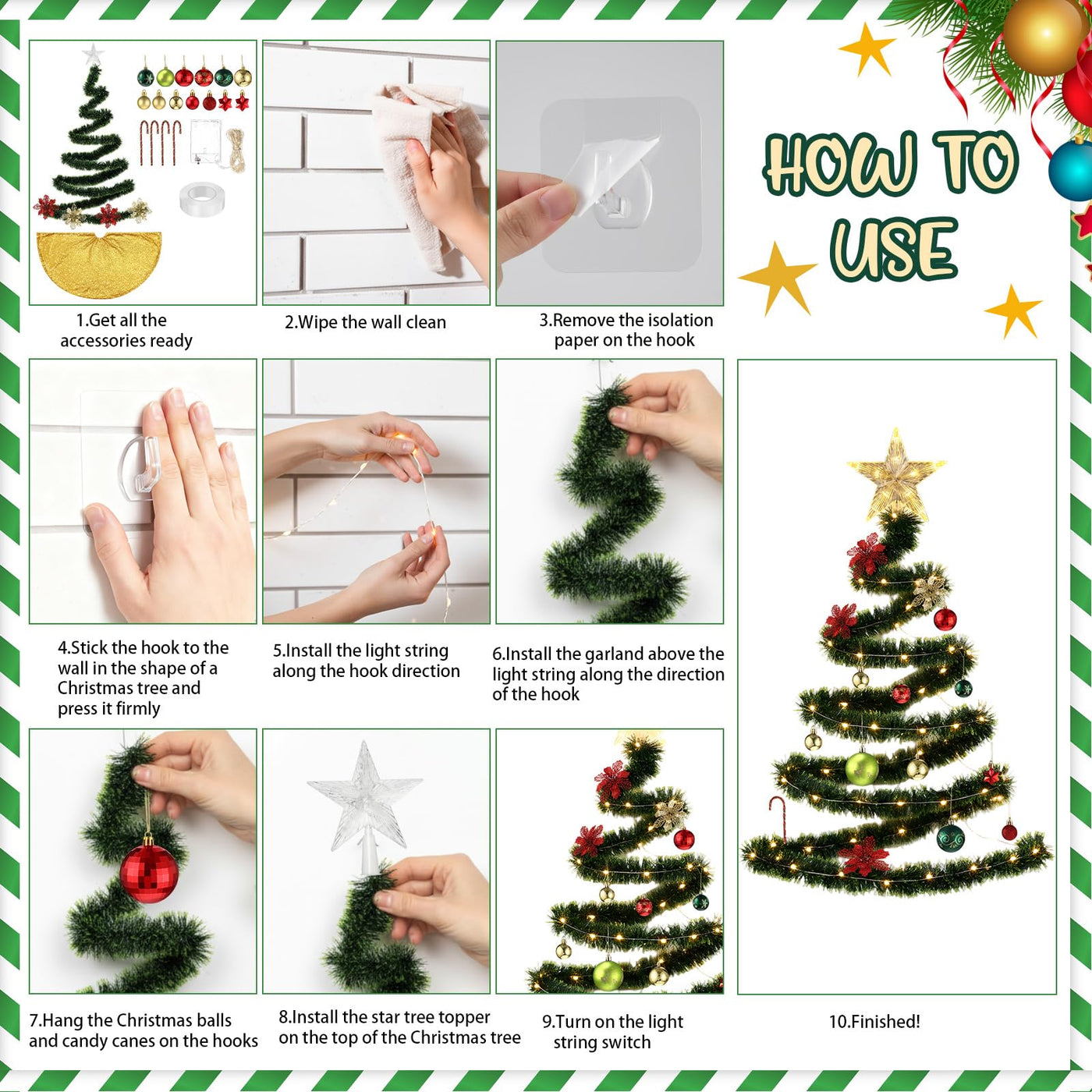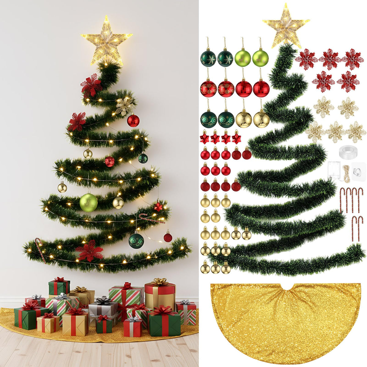 HyDren 91 Pcs DIY Wall Christmas Tree Kits, 66 Ft Xmas Garland Star Topper Tree Skirt Ball Ornaments String Lights Candy Cane Po