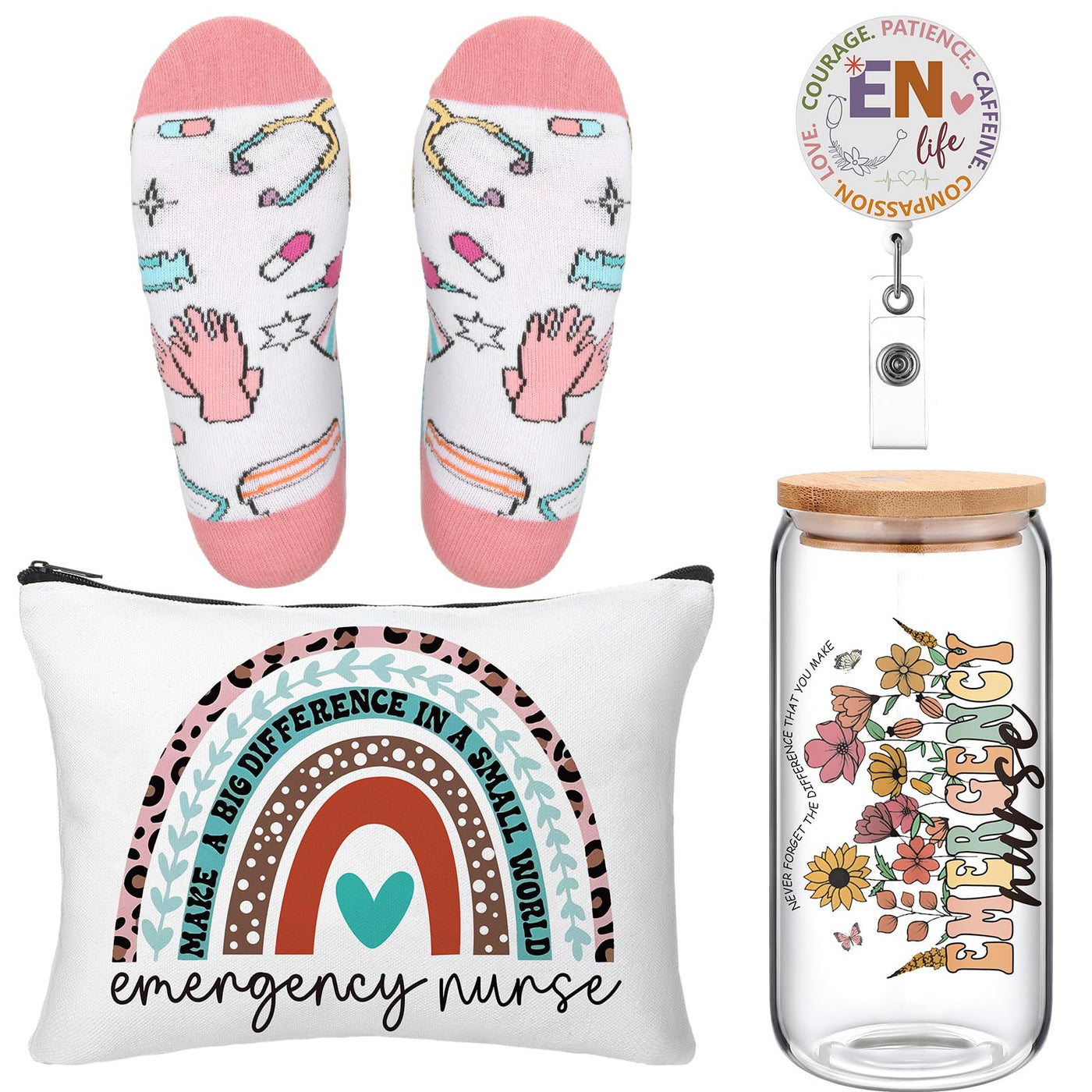 Skylety 5 Pcs Christmas ER Nurse Gifts for Women Set 16 oz Glass Cup Socks Cosmetic Bag Badge Holder Thank You Emergency Nurse A